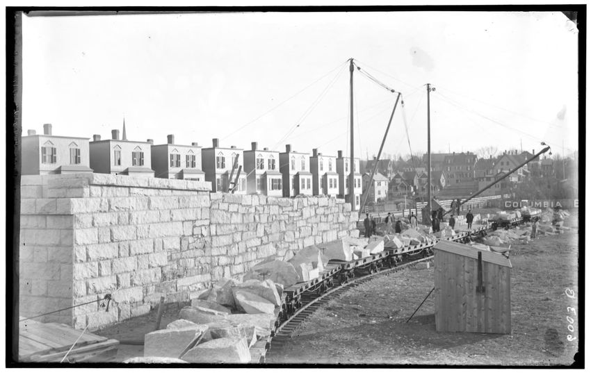 The image depicts the construction of a large stone wall along Everett Street in Boston, Massachusetts. Several workers are present, and a crane system is being used to position the stone blocks. The wall runs parallel to a row of residential buildings in the background, and there is a small wooden ...