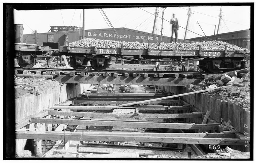 The image shows a freight yard in Boston, Massachusetts, featuring a coal pocket. A railroad flatcar marked "B & A" is loaded with coal and positioned over a wooden structure with exposed beams. In the background, a building displays the sign "B. & A.R.R. Freight House No. 6." A person is visible st...