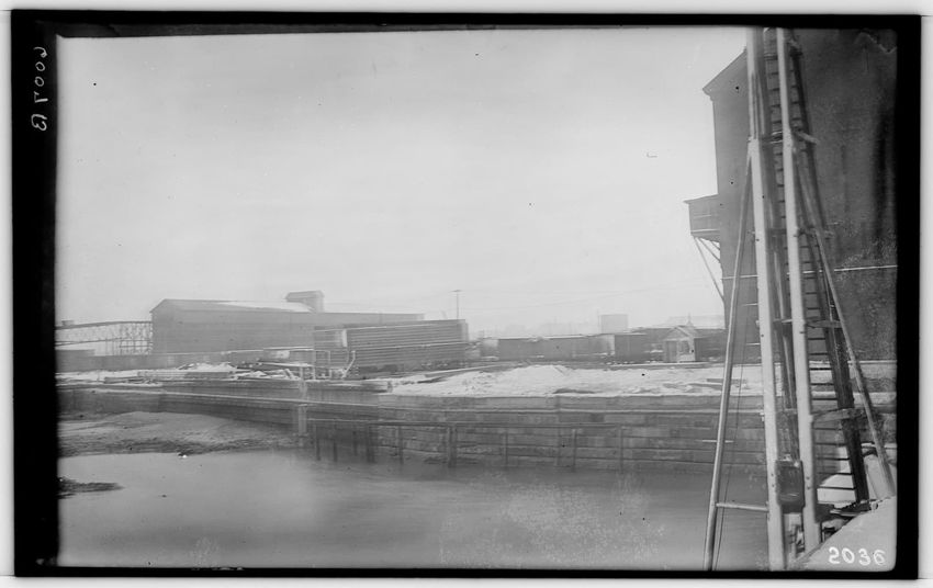The image depicts the New York, New Haven, & Hartford railroad docks in South Boston, Boston, Massachusetts. A retaining wall is visible alongside the water, with industrial buildings and railroad tracks in the background. A tall structure, possibly part of the dock equipment, is on the right side o...
