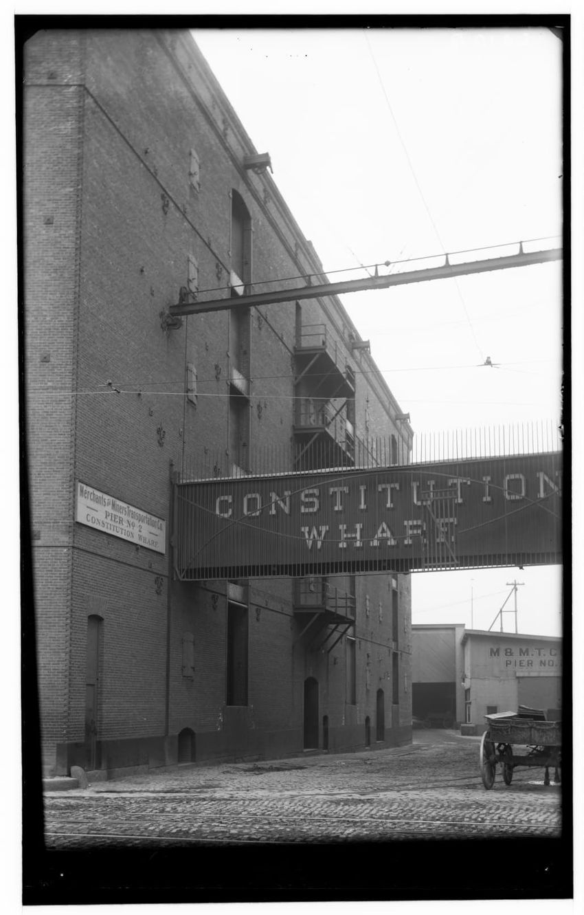 The image depicts the Constitution Wharf Warehouse located at Pier 1 on Atlantic Avenue in Boston, Massachusetts. A large brick building is visible with a sign reading "Constitution Wharf." There is a pedestrian bridge connecting buildings, and a sign on the building reads "Merchants & Miners Transp...