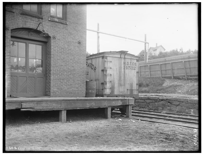 The image shows a section of a freight yard in Worcester, Massachusetts. A brick freight house is partially visible on the left, with large wooden doors and a light fixture above. Adjacent to the freight house is a wooden freight car labeled "M. D. T. CO. 14512" with "Refrigerator" partially visible...
