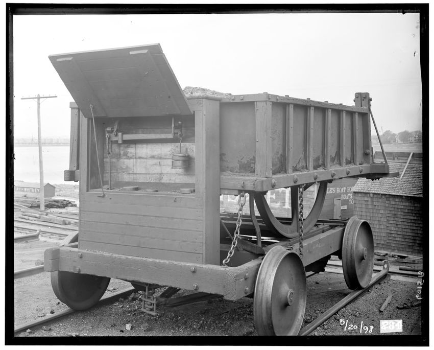 The image shows a coal dump car positioned next to a coal pile at the enginehouse in Cottage Farm, currently known as Beacon Park Yard, located in Allston, Boston, Massachusetts. The car is on tracks and has an open, slanted top indicating it is used for dumping coal. In the background, there are st...