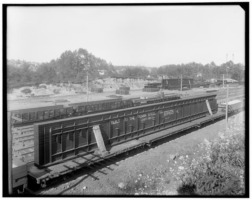 The image shows steel girders intended for the Franklin Street Bridge in Worcester, Massachusetts, loaded on a railcar. The girders have text indicating they were built by the "Penna Steel Co. Steelton, PA." They are positioned on train tracks, with additional rail cars visible in the background. Tr...