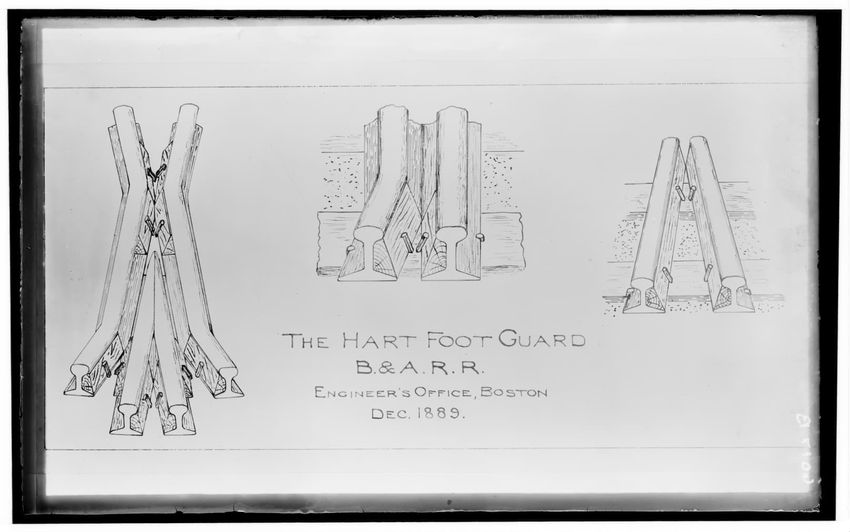 The image is a technical drawing of the Hart Foot Guard for rails, labeled with "B. & A. R. R." It features three views of the rail guard design. Below the illustrations, the text reads, "The Hart Foot Guard, B. & A. R. R. Engineer's Office, Boston, Dec. 1889."