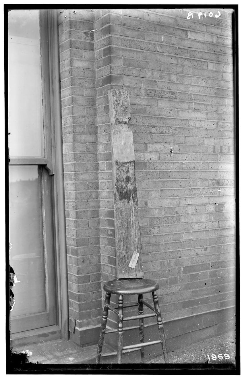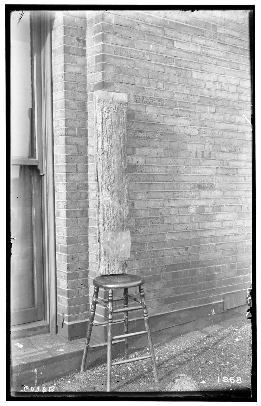 The image shows a piece of sheet piling displaying signs of pest damage. It is propped against a brick wall and positioned on a stool.