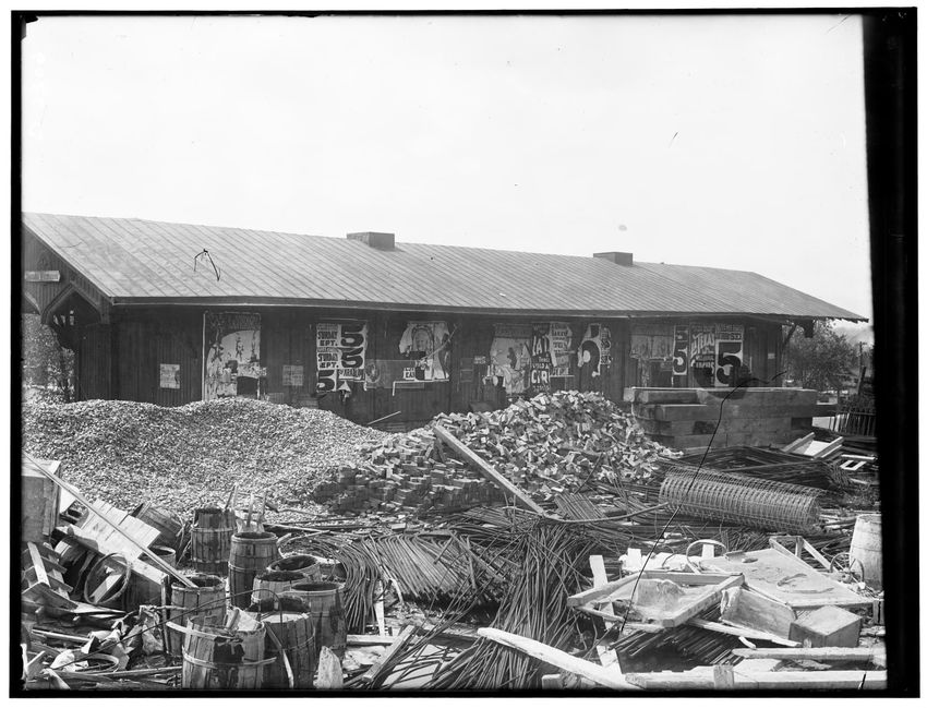 The image shows a storage warehouse in Pittsfield, Massachusetts. The building has a pitched roof and is covered with various posters. In the foreground, there are piles of bricks, barrels, and debris scattered around the area.