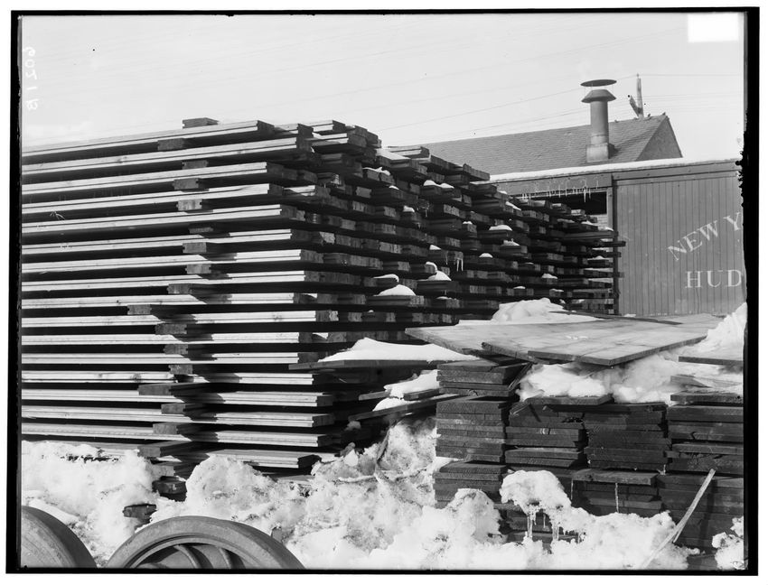The image shows stacks of lumber used for car repairs at repair shops in Allston, Brighton, Boston, Massachusetts. The lumber is piled neatly, with snow visible on and around the stacks.