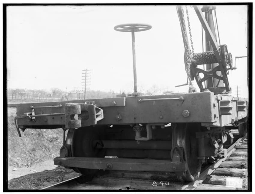 The image shows a piece of hoist equipment used in filling in a dump at Faneuil Station, Boston, Massachusetts. It features a rail-mounted metal frame with visible wheels and a winch mechanism, situated on tracks. The background includes power lines and trees.