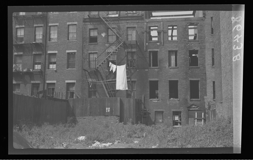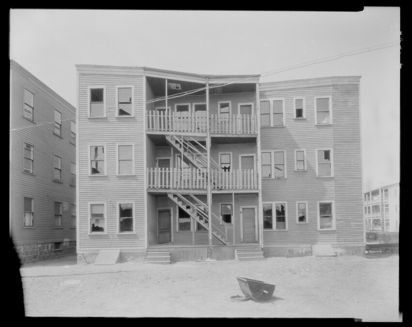 The image depicts the side exterior of a house located at 11 Lincoln Place, Brighton, Boston, Massachusetts. It shows a wooden door with visible wear, part of the house's siding, and a wagon wheel leaning against the structure. Snow is present on the ground and on surfaces, with scattered debris and...