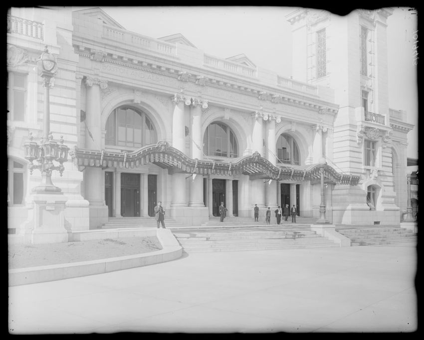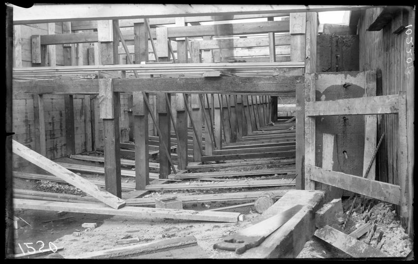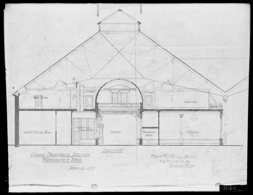 The blueprint depicts a sectional view of the Old Union Railroad Station in Worcester, Massachusetts. The drawing includes labeled areas such as the "Ladiesâ Dressing Room," "Gentlemen's Room," "Corridor," "Kitchen," and "Laundry," among others. Architectural features and dimensions are illustrate...