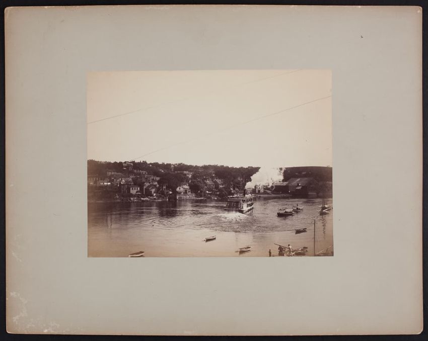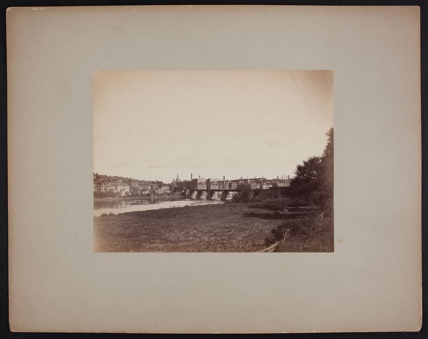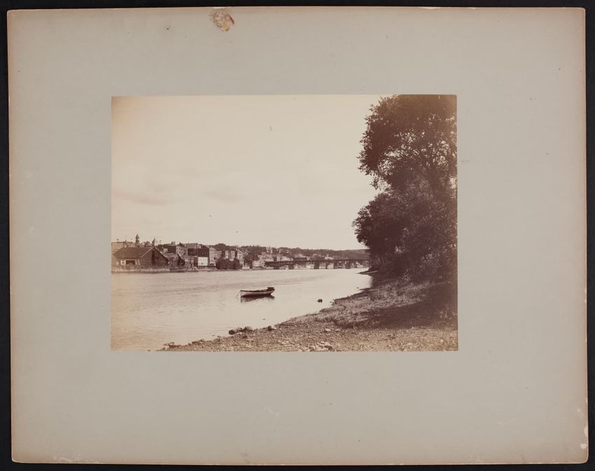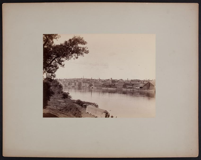 View of Haverhill, Massachusetts, from a bank of the Merrimack River. The Haverhill and Bradford Bridge can be seen in the distance. The three towers seen across the river and to the left are City Hall, the Presbyterian Church, and Grace Church. A small boat is moored in the center of the photogr...