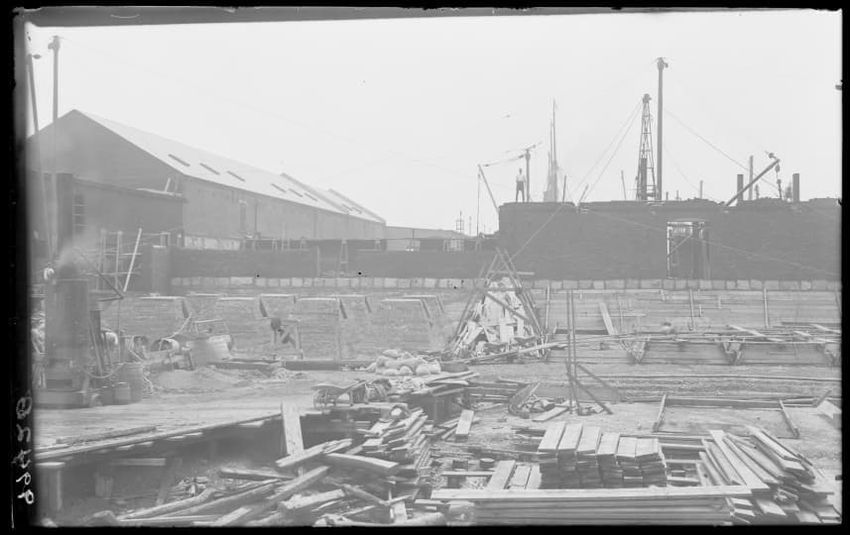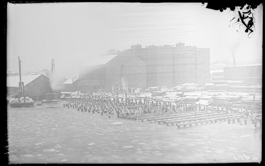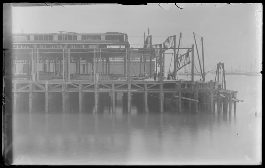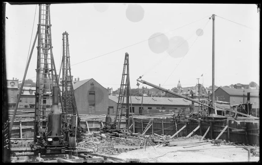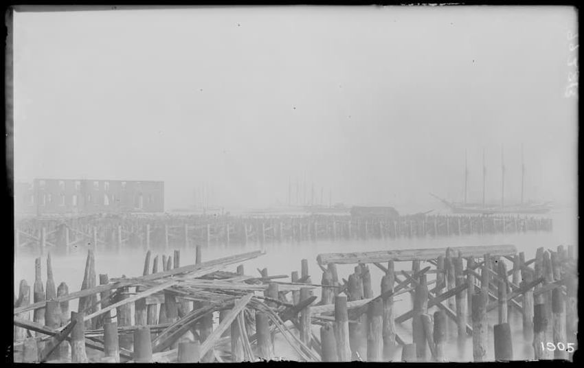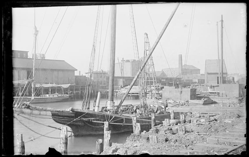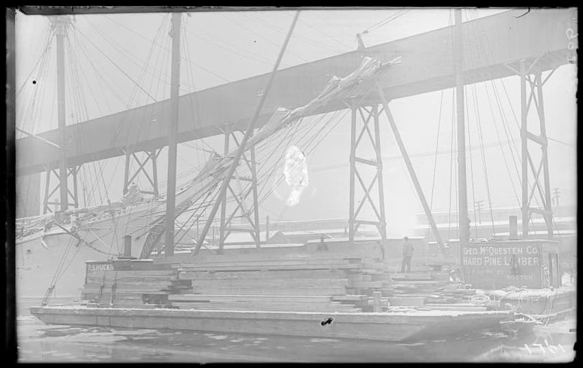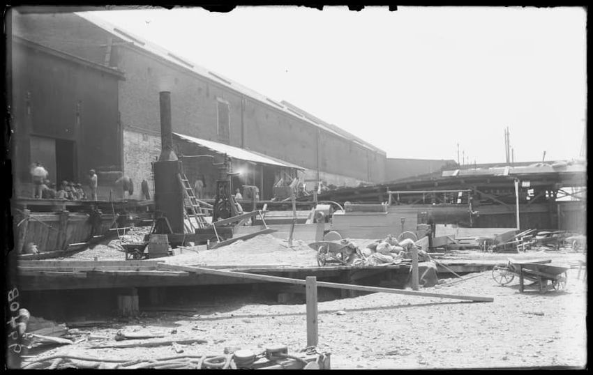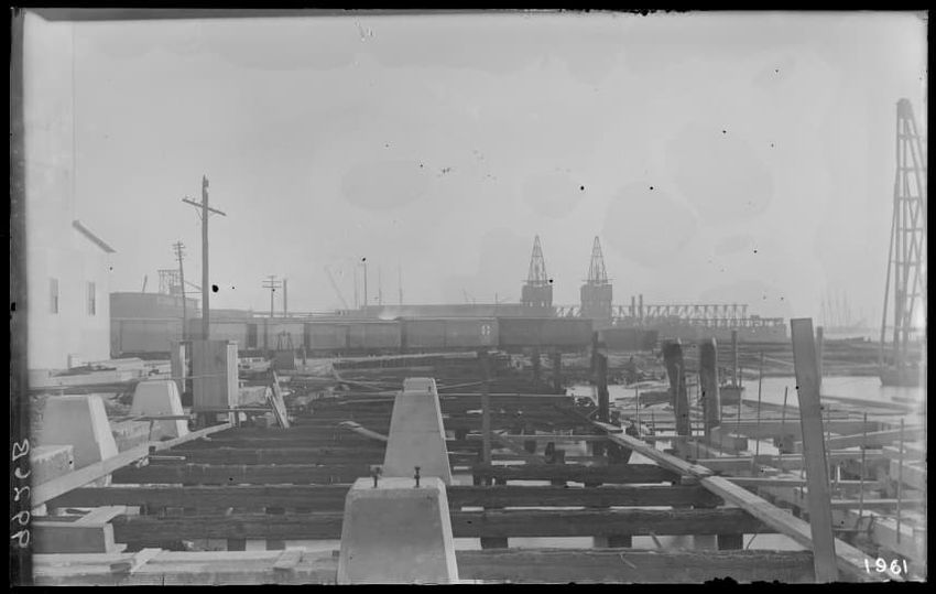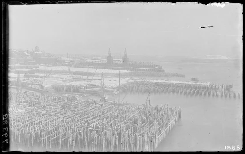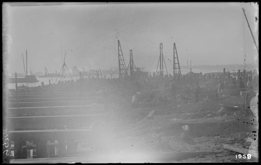 The image shows the early stages of reconstruction of the Cunard Line Pier, platform dock #3, in East Boston, Massachusetts, looking southeast. The scene includes various construction materials and wooden beams laid out across the dock area. In the background, industrial structures, cranes, and part...