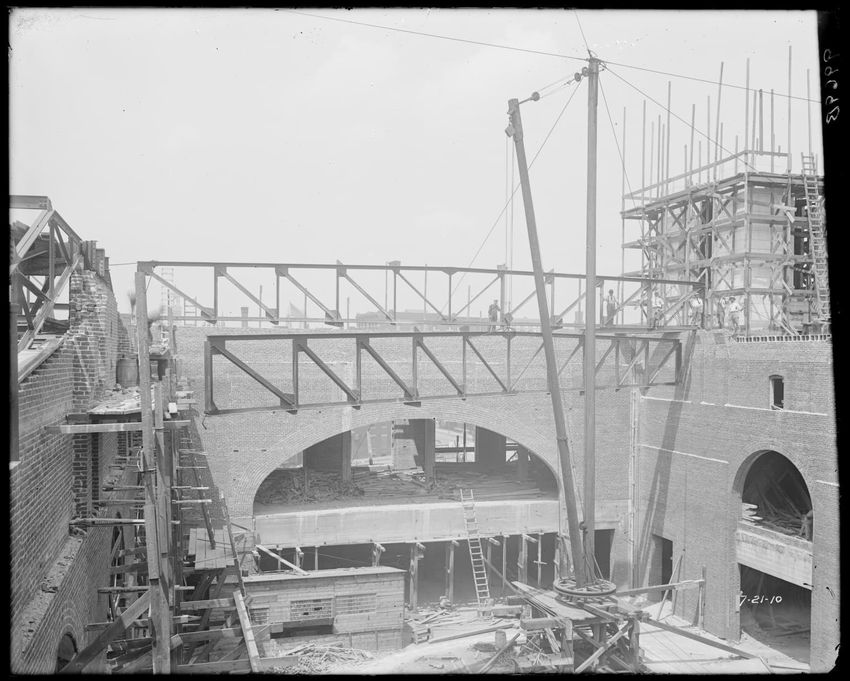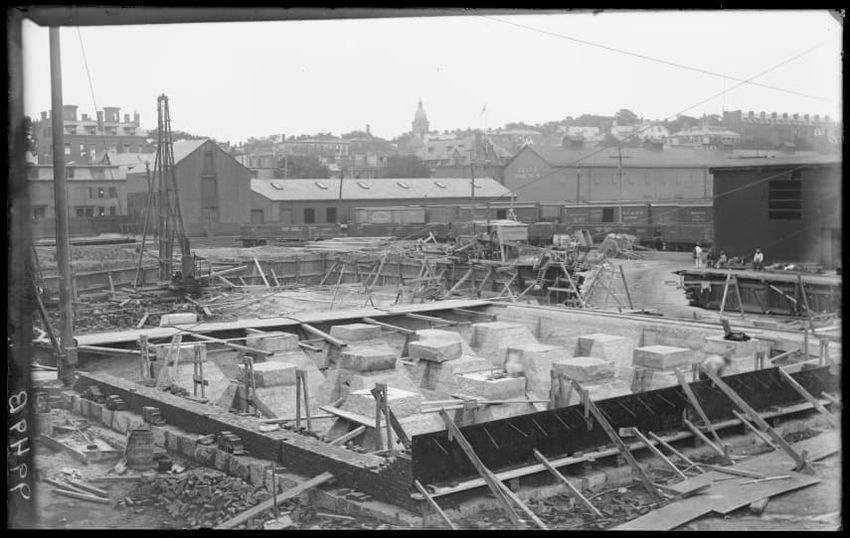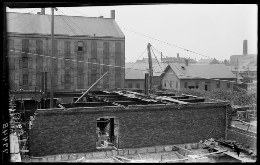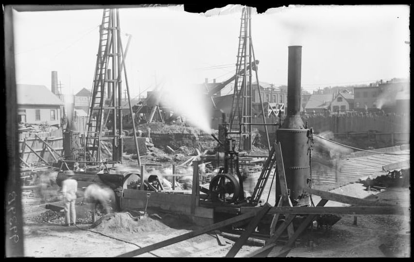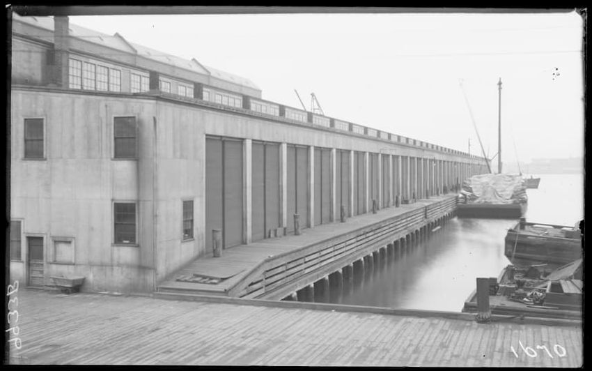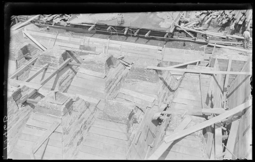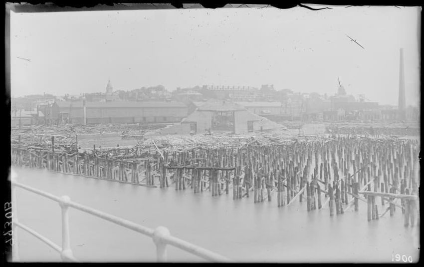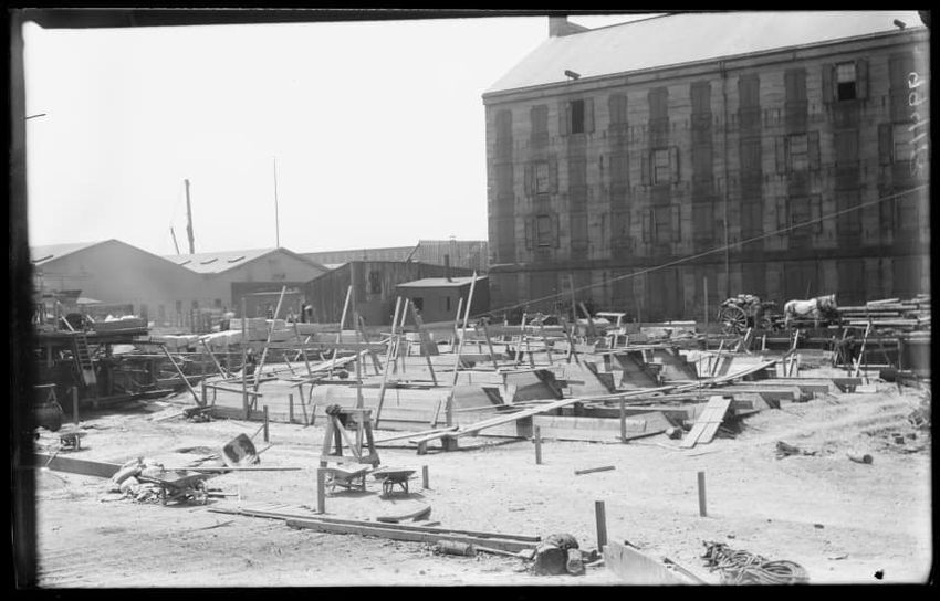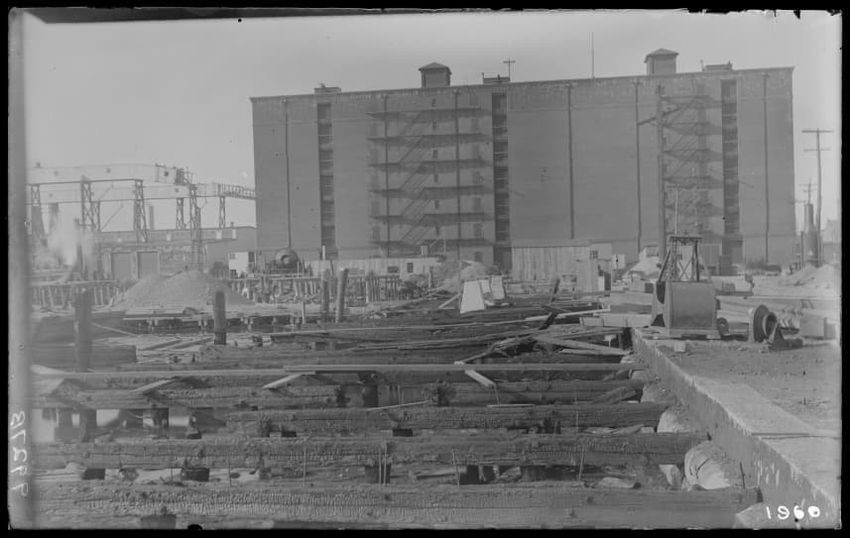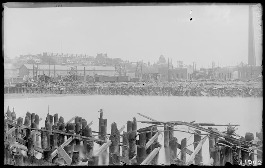 The image shows the early stages of reconstruction of the Cunard Line Pier, platform dock #3, in East Boston, Massachusetts, looking southeast. The scene includes various construction materials and wooden beams laid out across the dock area. In the background, industrial structures, cranes, and part...