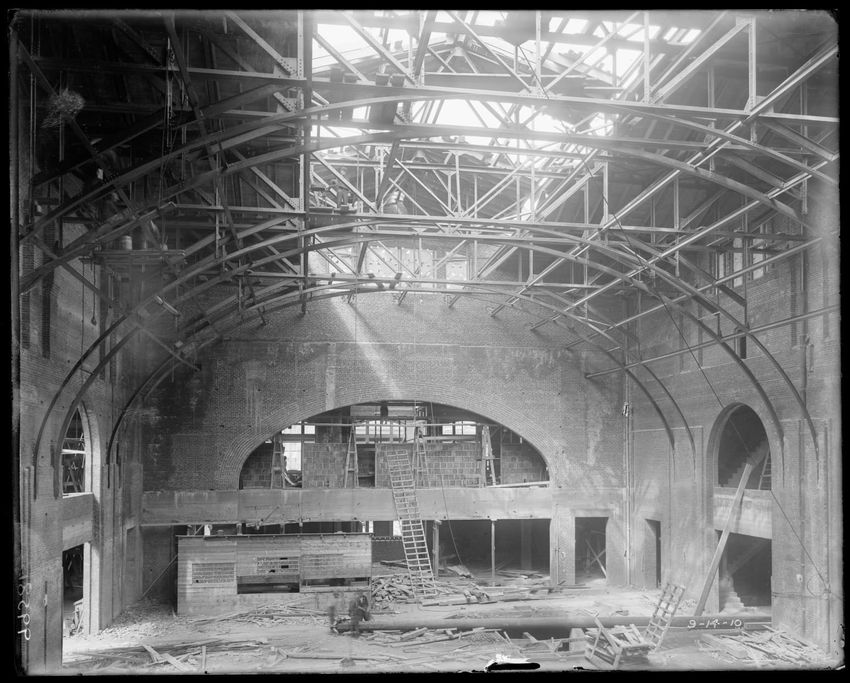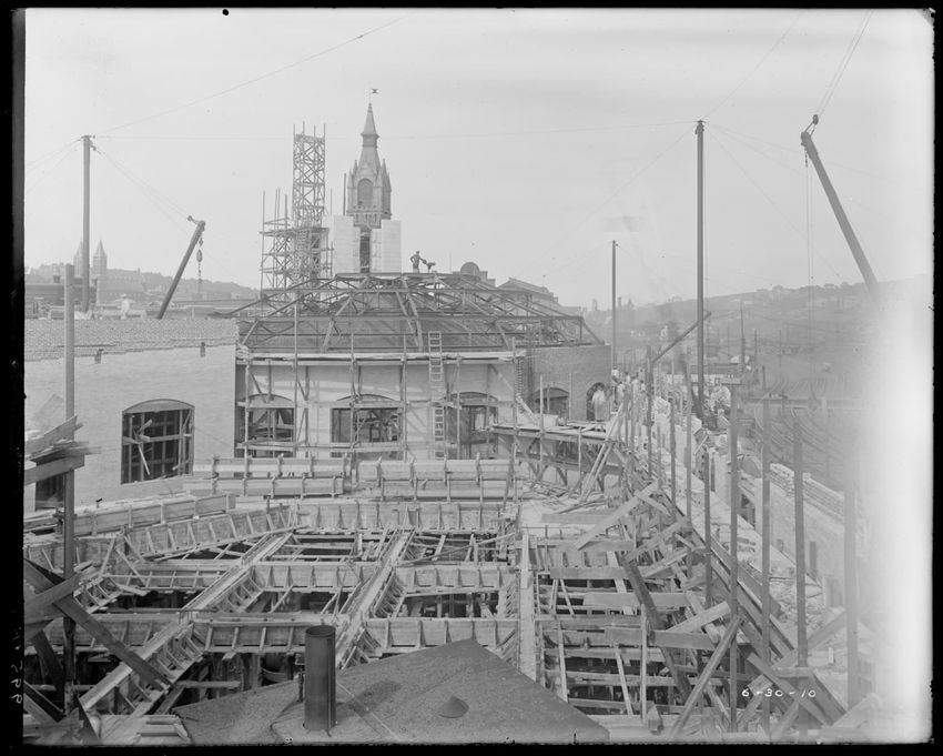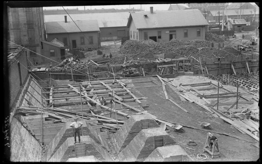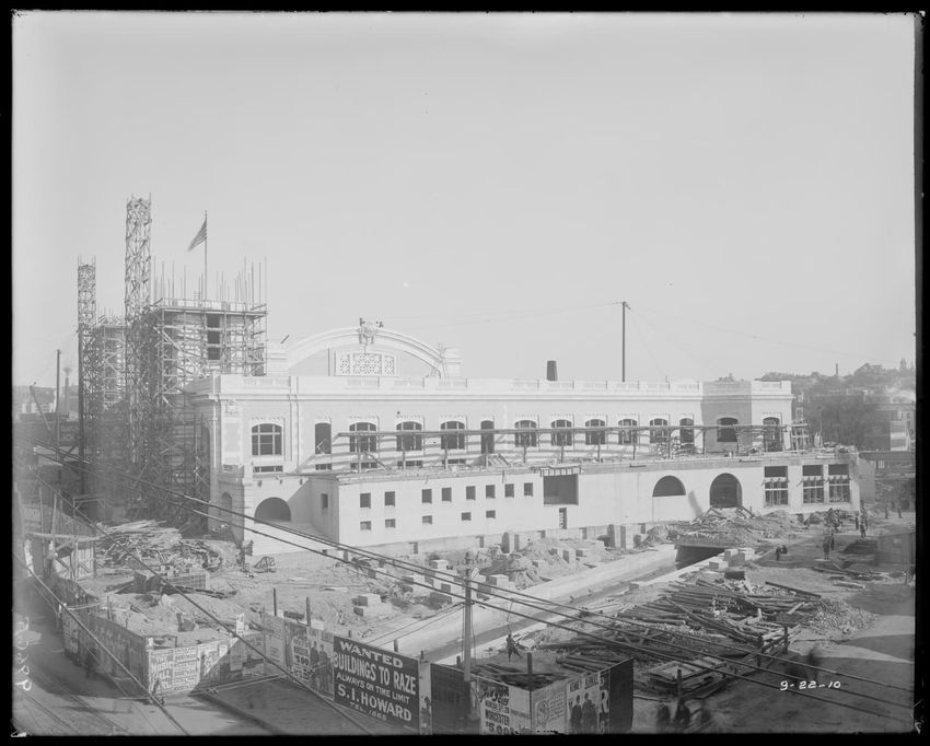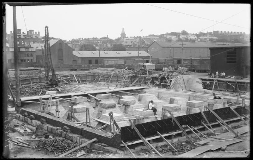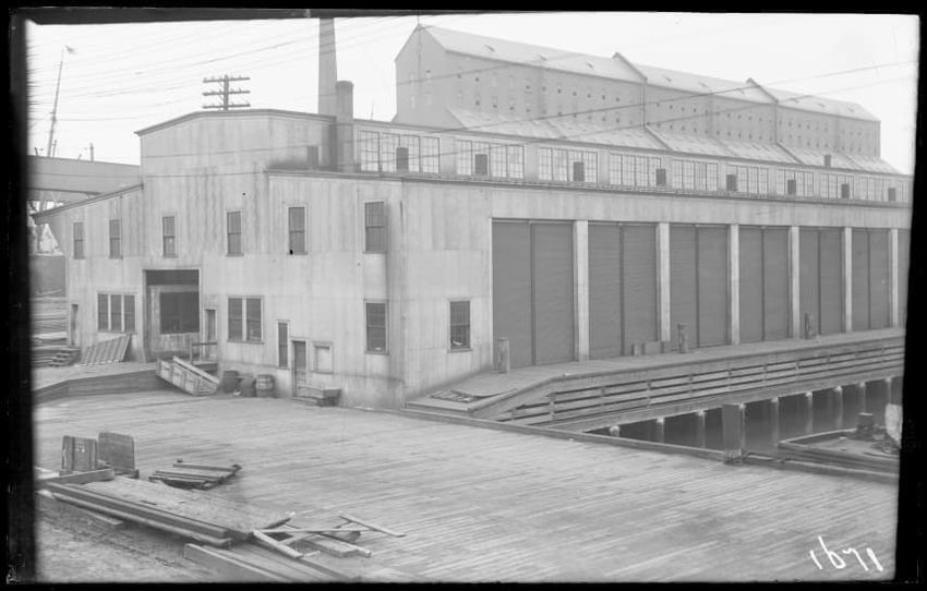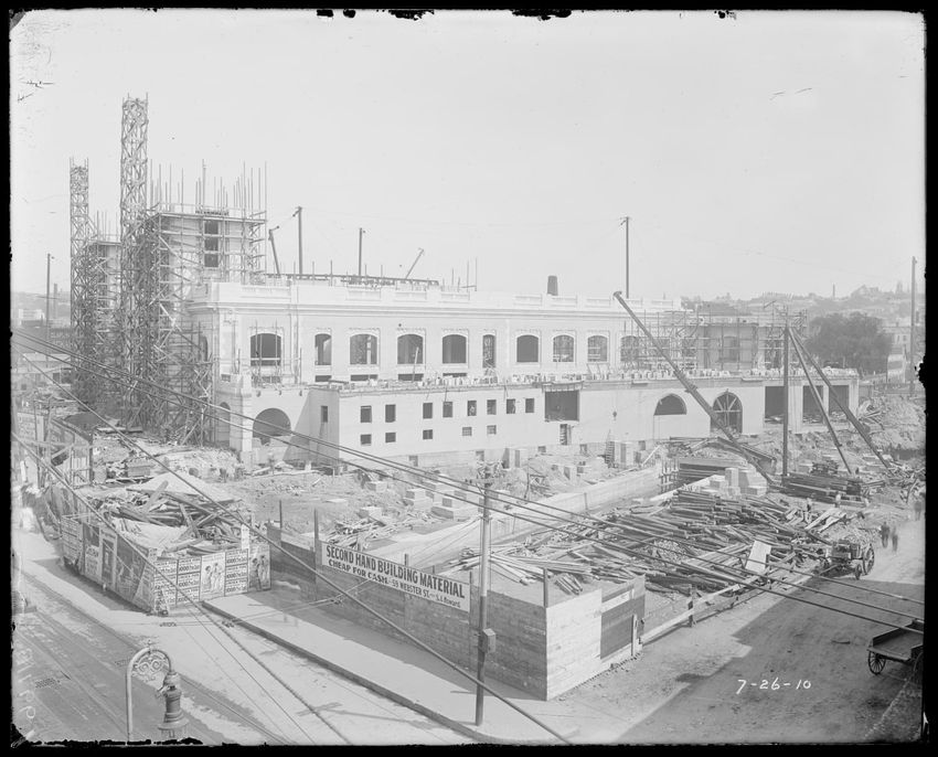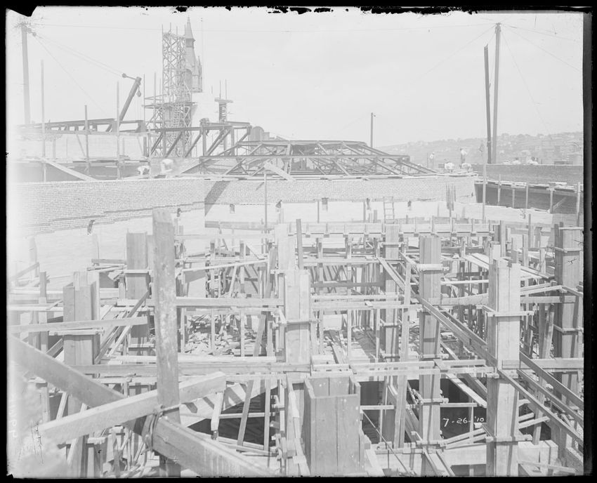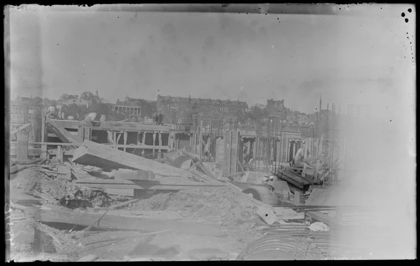 The image shows the early stages of reconstruction of the Cunard Line Pier, platform dock #3, in East Boston, Massachusetts, looking southeast. The scene includes various construction materials and wooden beams laid out across the dock area. In the background, industrial structures, cranes, and part...