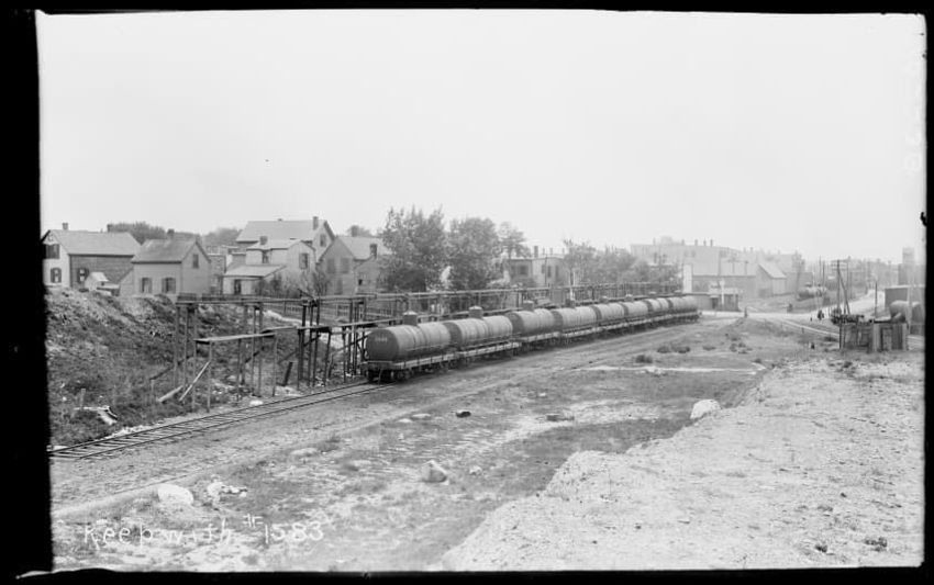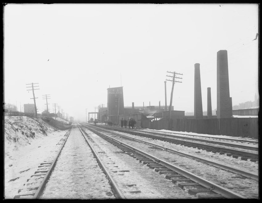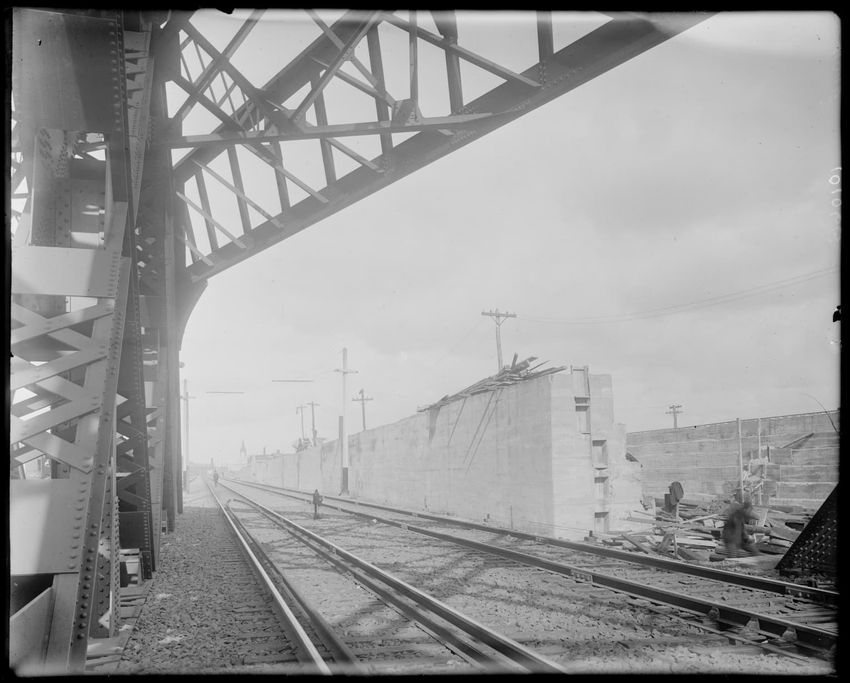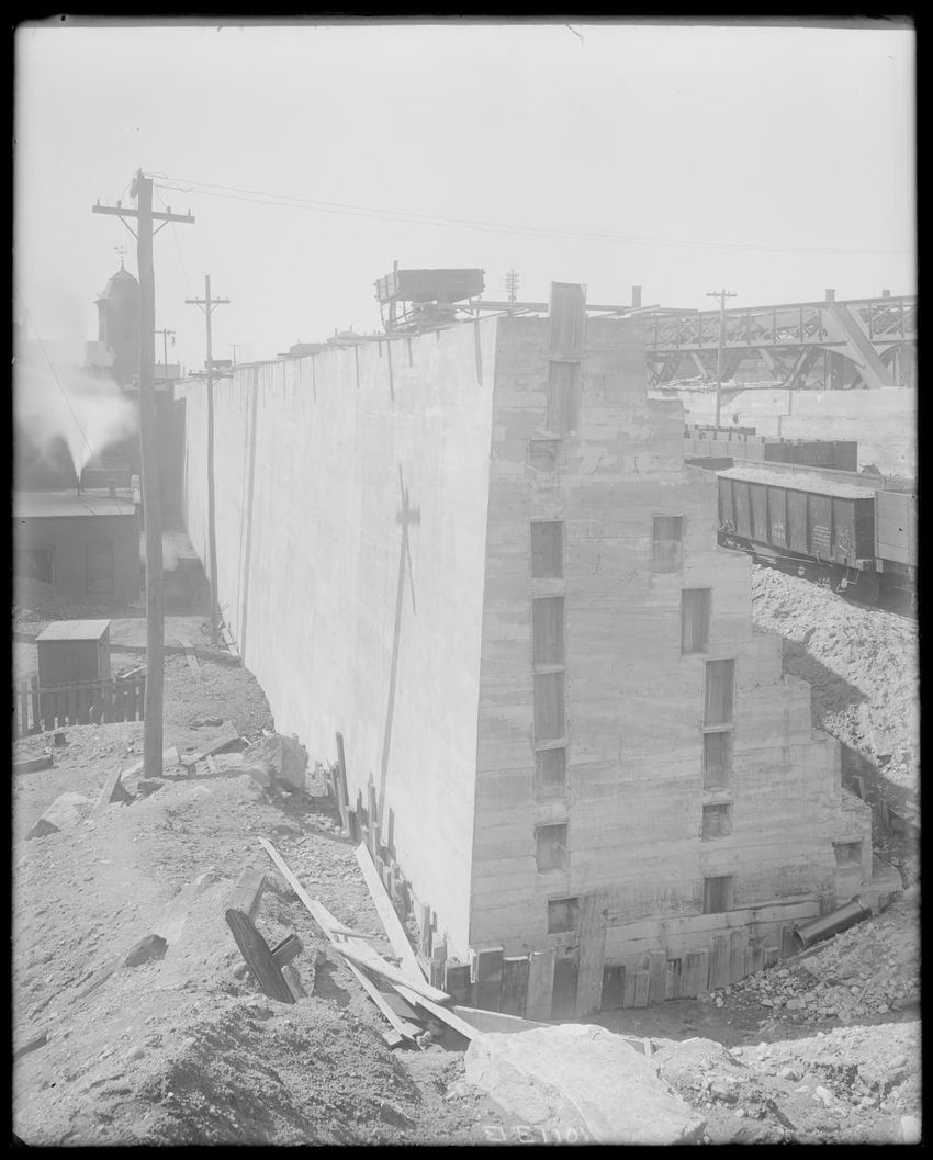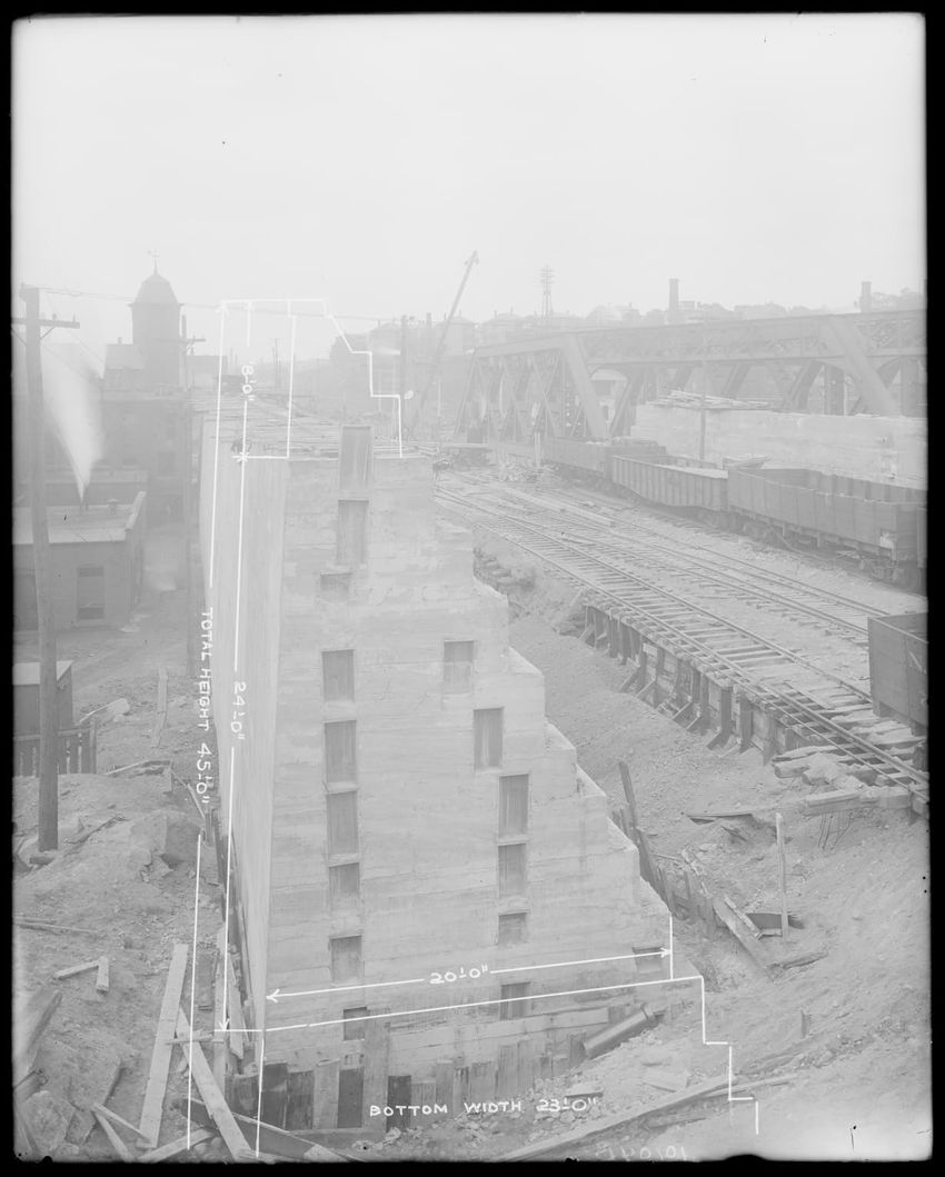 The image depicts a large, sloped wall near a railroad in Worcester, Massachusetts, associated with the Queensbury Mill. Visible are several utility poles and a train rail with freight cars. In the background, there is a large structure, possibly a bridge, and a small building near the wall. Various...