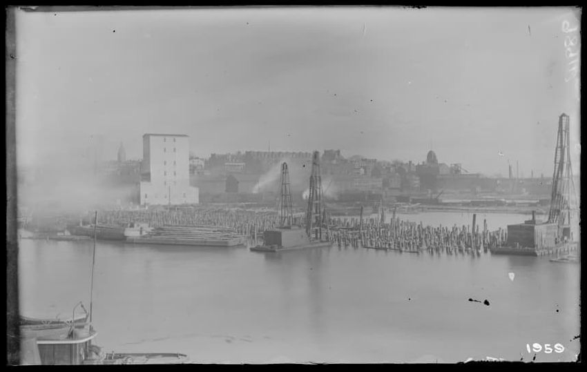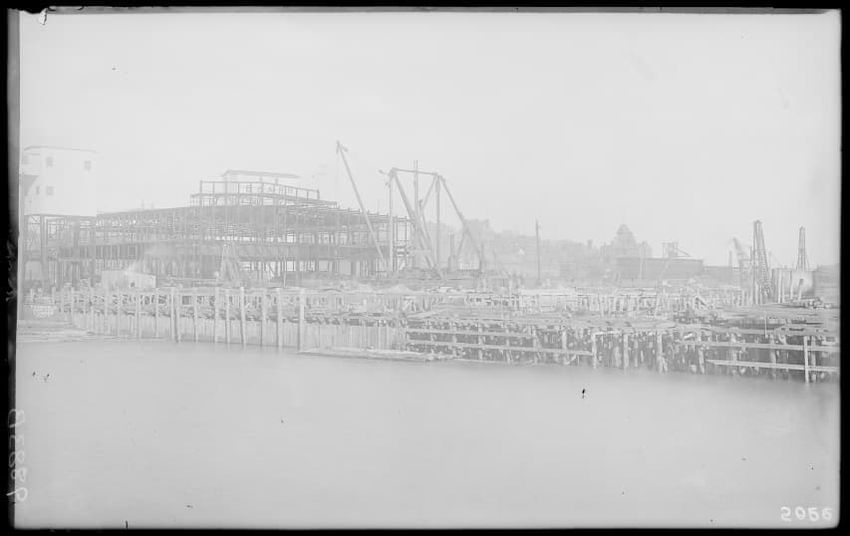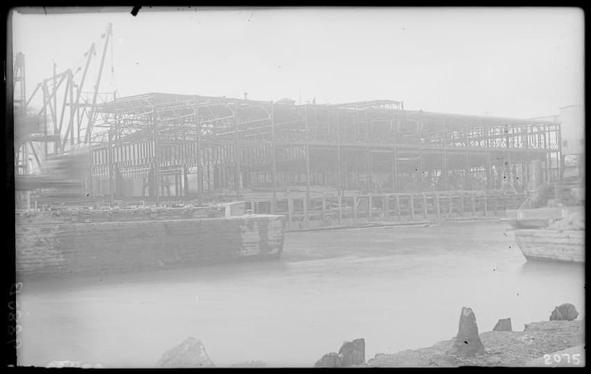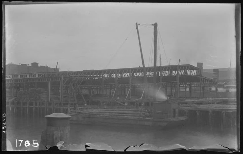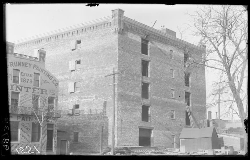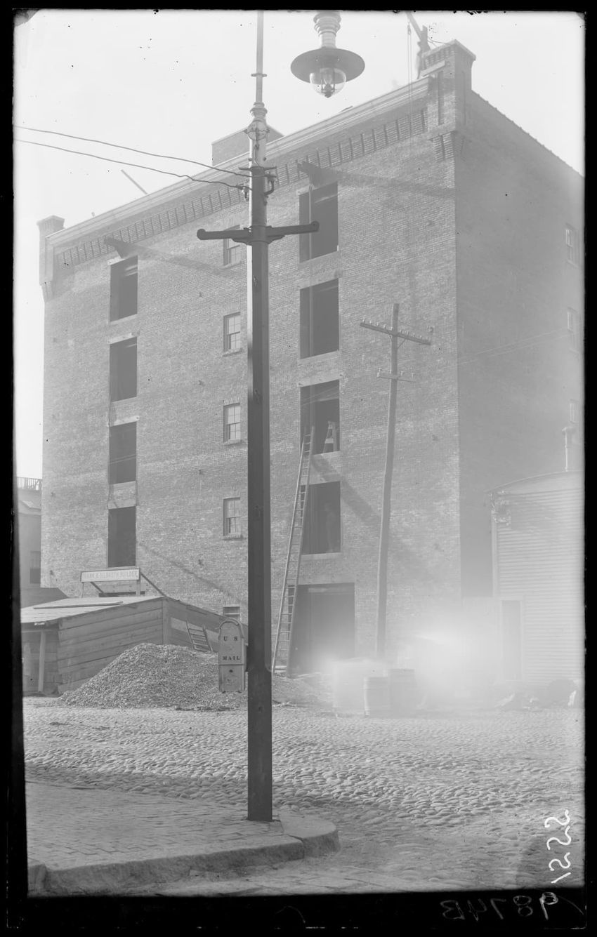 The image shows a multi-story brick warehouse on New Street, viewed from the northeast, in East Boston, Massachusetts. The building has several open windows and a long ladder is leaning against it, reaching up to one of the windows. In the foreground, a utility pole with wires and a streetlamp is vi...