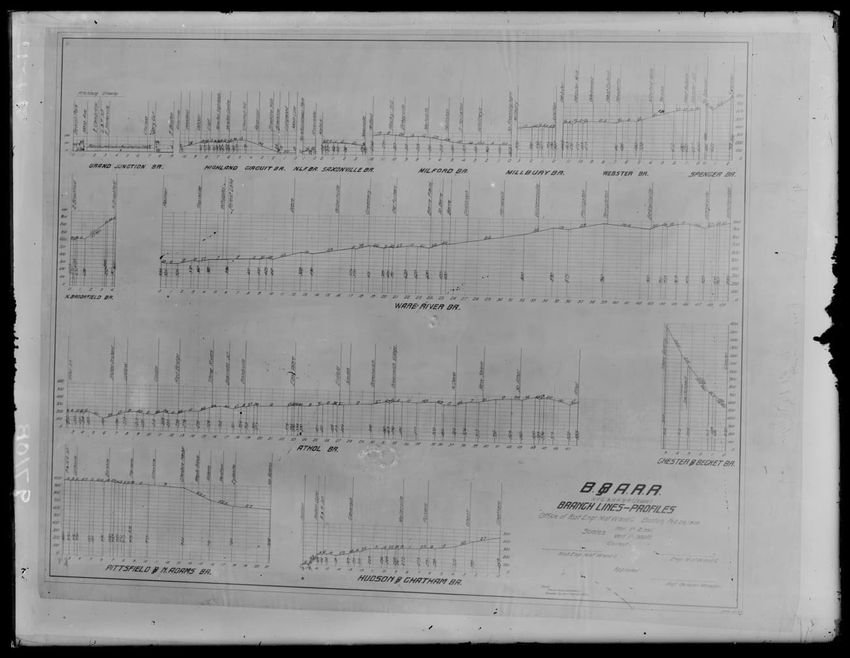 The image displays a detailed diagram of branch line profiles for the Boston and Albany Railroad. It includes various segments such as the Grand Junction, Highland Circuit, Saxonville, Milford, Millbury, Webster, Spencer, and Ware River branches, among others. Each profile illustrates the elevation ...