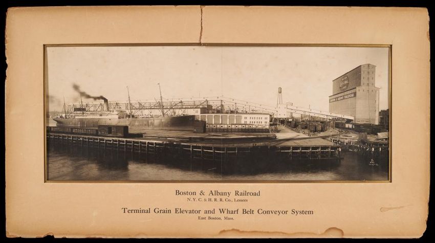 The image depicts Commercial Wharf in Boston, Massachusetts. It features a large, multi-story brick building with multiple rows of windows, situated along the water's edge. Several ships are docked alongside the wharf, including a large steamship and smaller sailing vessels. There are piles of mater...