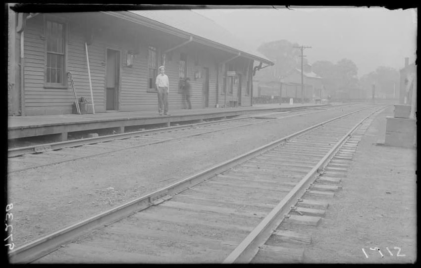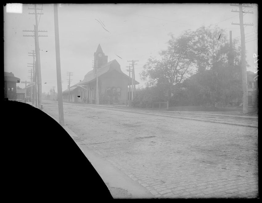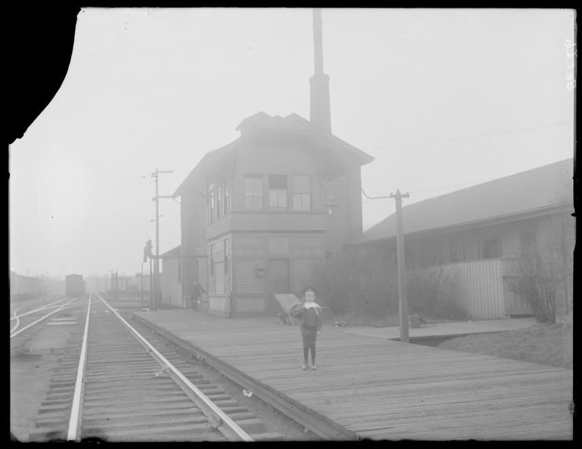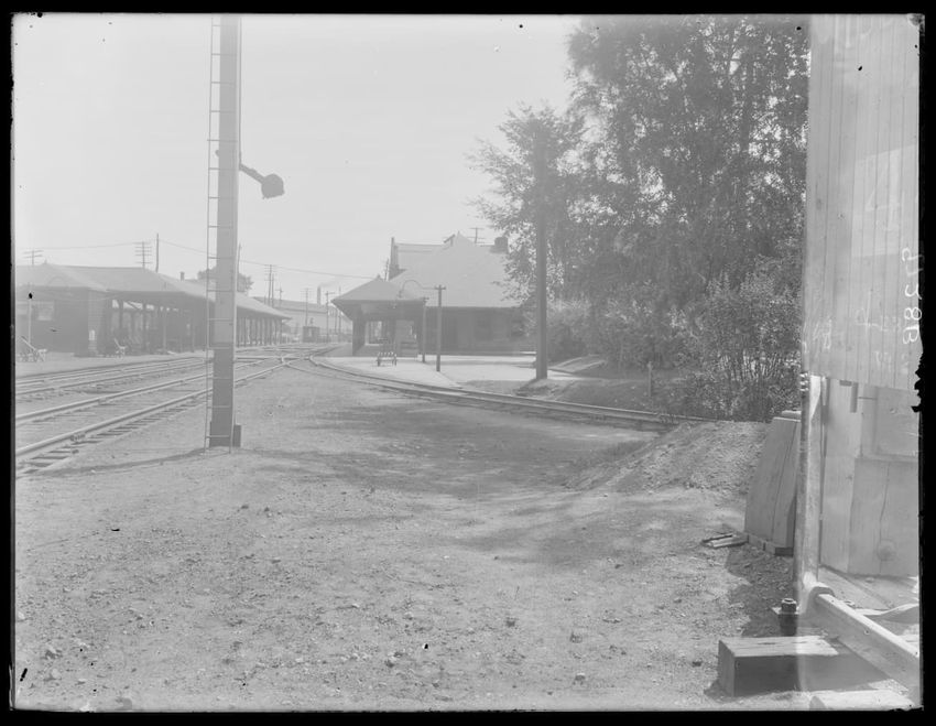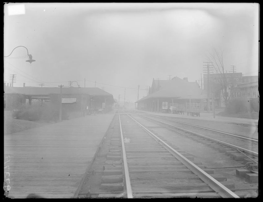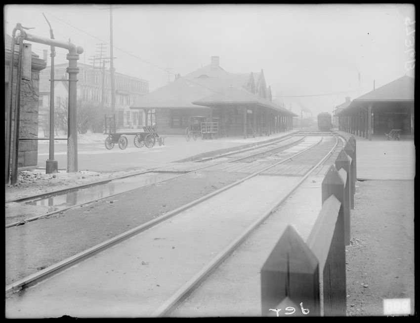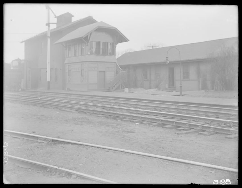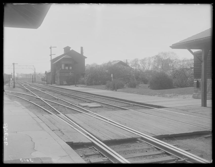 The image depicts a railroad station in Framingham, Massachusetts, looking east. Visible elements include the train tracks running from the foreground to the background, a platform area on the left, and a station building with a pitched roof on the right. Additionally, there are utility poles and a ...