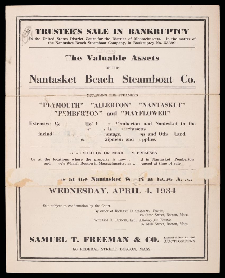 Printed, folded, 13 x 20 leaflet announcing the sale of the assets of the Nantasket Beach Steamboat Company by the Samuel T. Freeman & Co. Auctioneers. The leaflet notes the sale included steamships, wharves, land, cottages, furnishings, equipment, and supplies. The leaflet outlines sale items, incl...