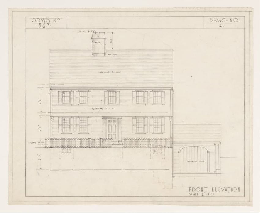 Set of twenty-three architectural drawings of house for Dwight H. Thomas in North Attleboro, Massachusetts (commission #581) including four elevations, four plans, one plot plan, one heating plan, two framing plans, three topographical surveys, and eight details. Topographical survey is by The Frank...
