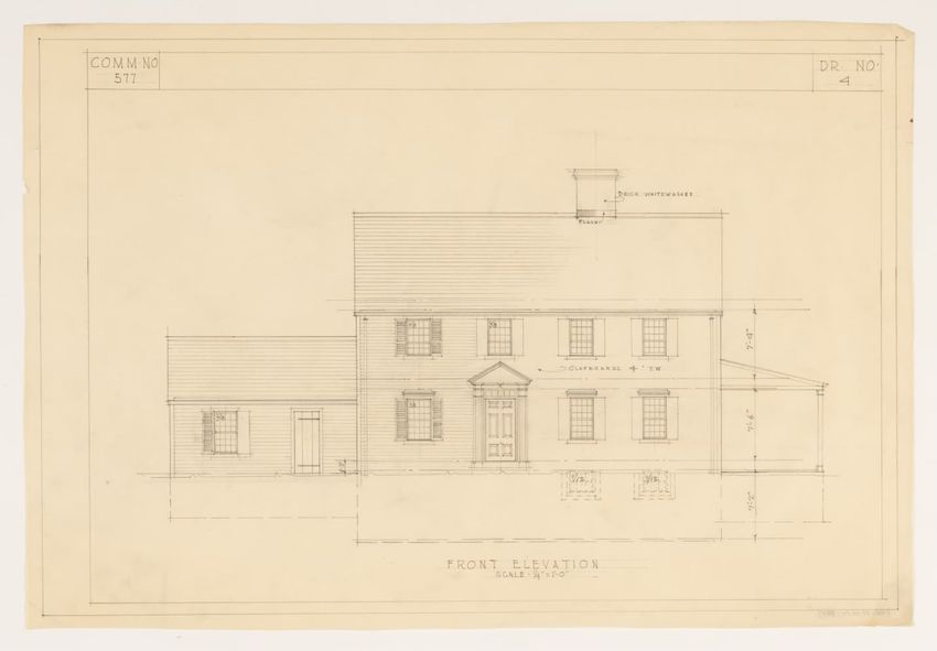 Set of six architectural drawings for alterationst to house for Mrs. Russell S. Cooney in Waldoboro, Maine (commission #555-A) including three elevations, one plan, and one detail. Two drawings are dated; four are signed by Robert E. Minot. Alterations include an addition with a bedroom and shed ...
