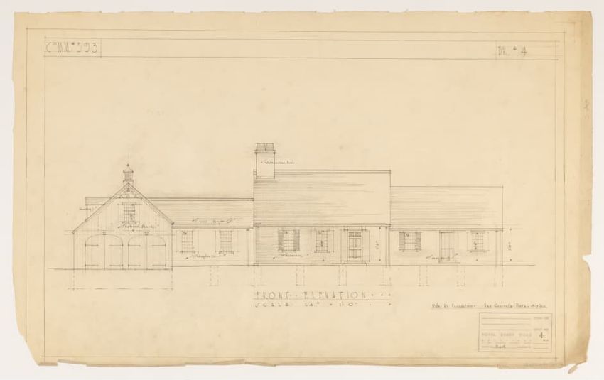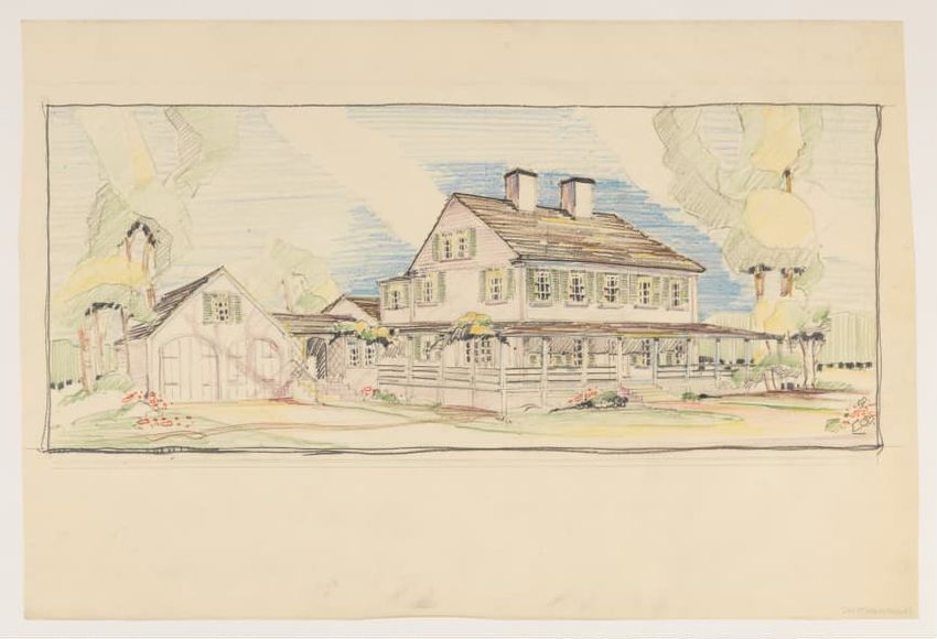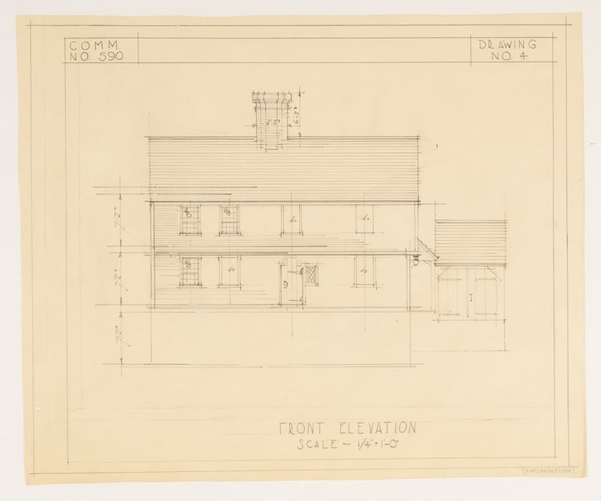 One elevation for alterations to house for a client named Mrs. Holmes in Kingston, Massachusetts (commission #586). Drawing is not dated or signed. Alterations include a one-story addition with bedroom and lavatory.