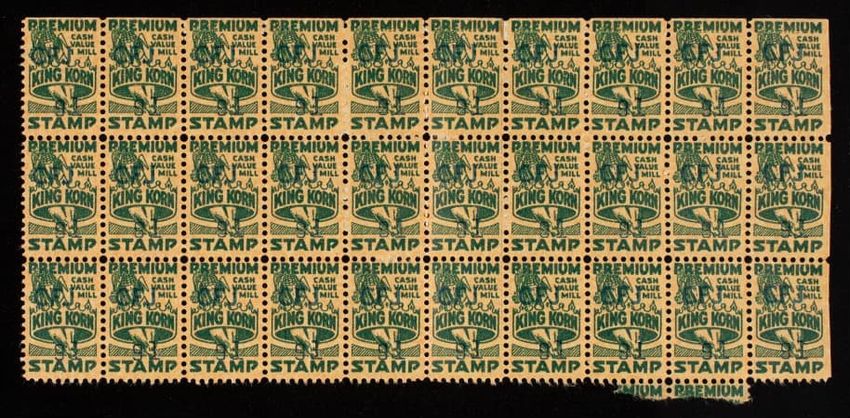 Envelope containing loose Gold Bond Stamps, Buckeye Stamps, Merchants Green Stamps, Premium King Korn Stamps