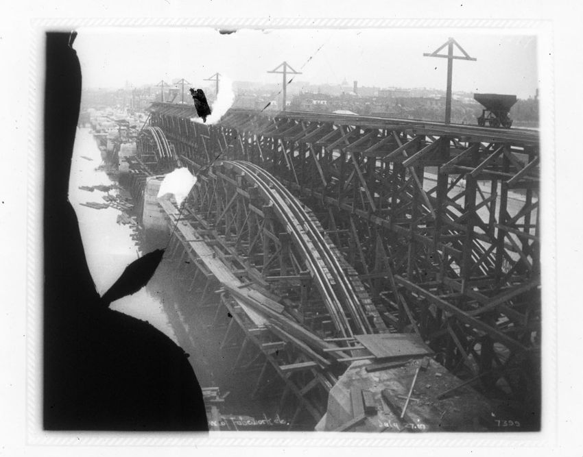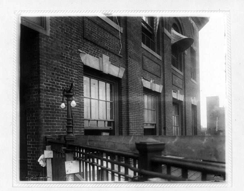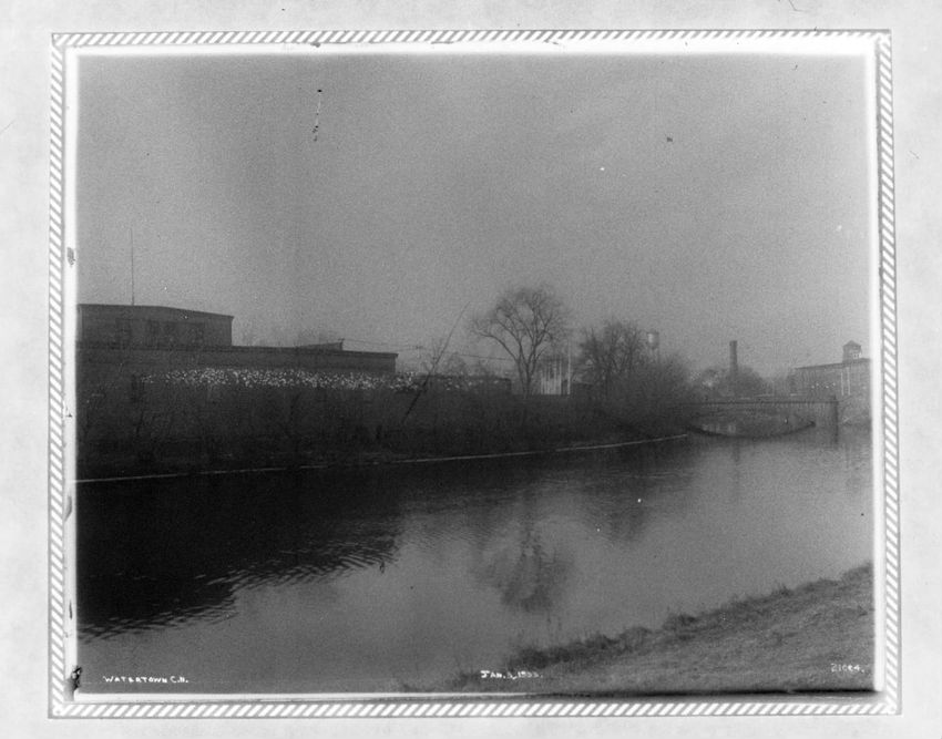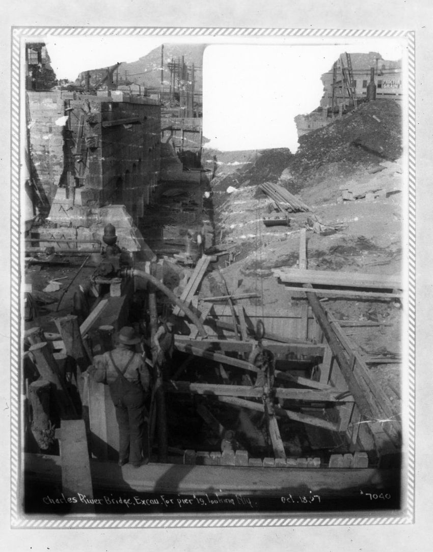 Work on the subway line can be seen at the intersection of Boylston and Charles Streets. The steeple of Arlington Street Church can be seen on the right with the steeple of the Old South Church further down.