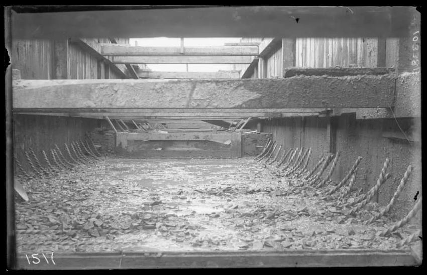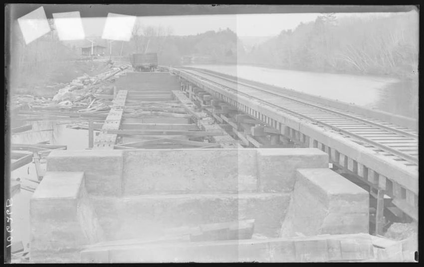 The image shows a wooden railroad bridge spanning over a body of water. There are metal tracks running along the bridge, leading towards the background. Debris, including wooden planks and logs, is visible near the water. In the background on the left, there appears to be a small building or structu...