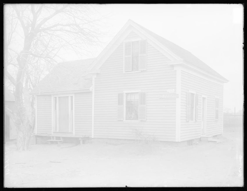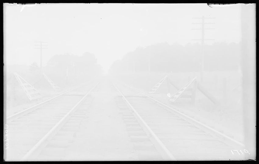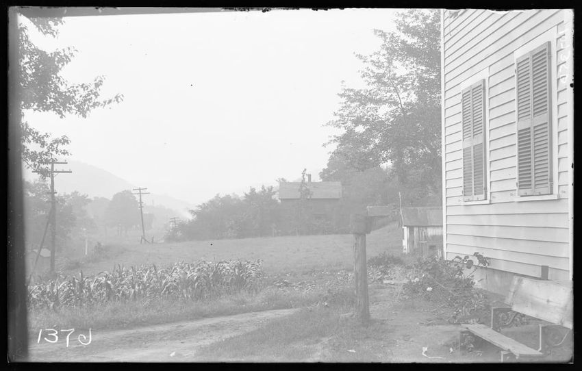 The image features a house located along railroad tracks in Chester, Massachusetts. The right side of the house is visible, with its siding and closed shutters. In the background, there are trees, telephone poles, and a building further down the grassy area. The railroad tracks run parallel to the h...