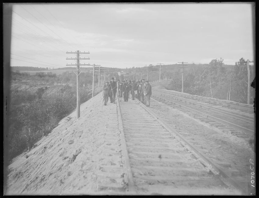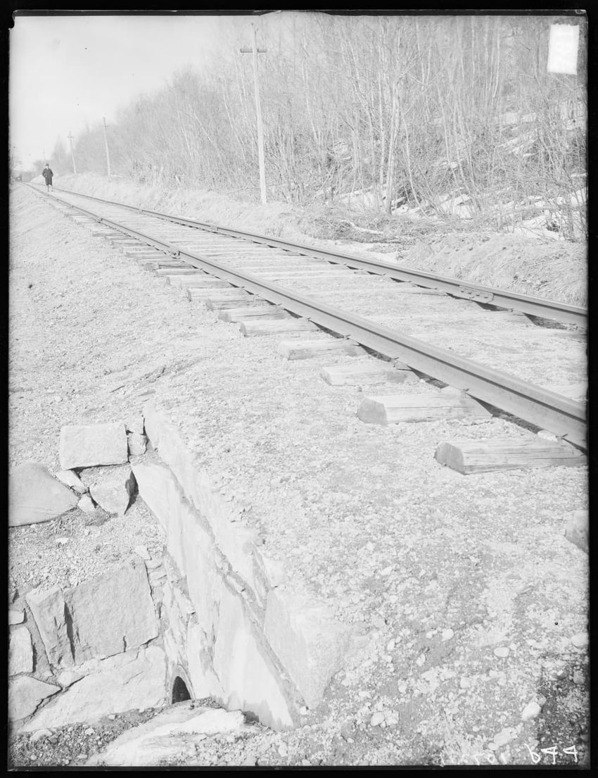 The image shows a stretch of railroad tracks running diagonally across a gravel-covered area. To the side of the tracks, a person is walking away from the camera. On the left, a line of utility poles follows the tracks. In the foreground, there is a stone-lined ditch or culvert beneath the tracks. L...