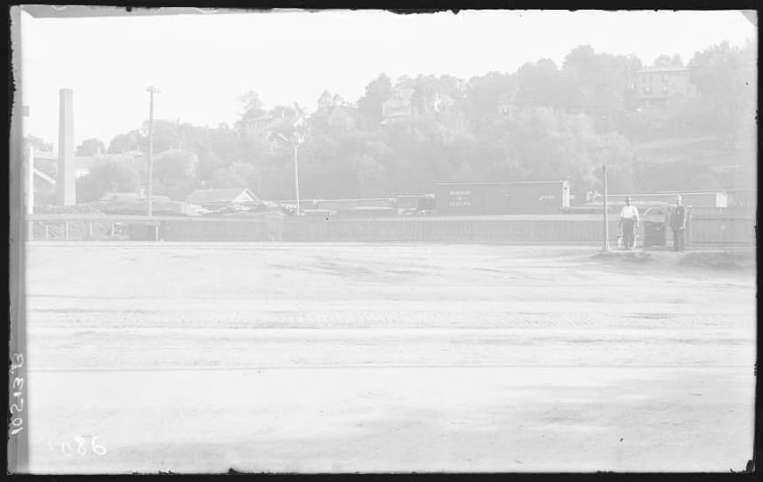 The image depicts a scene at Church Street in Newton, Massachusetts. In the foreground, there is open ground with a paved area leading towards a wooden fence. Beyond the fence, there are two men near a lamppost, and behind them is a railcar labeled "BOSTON AND ALBANY." In the background, there are t...