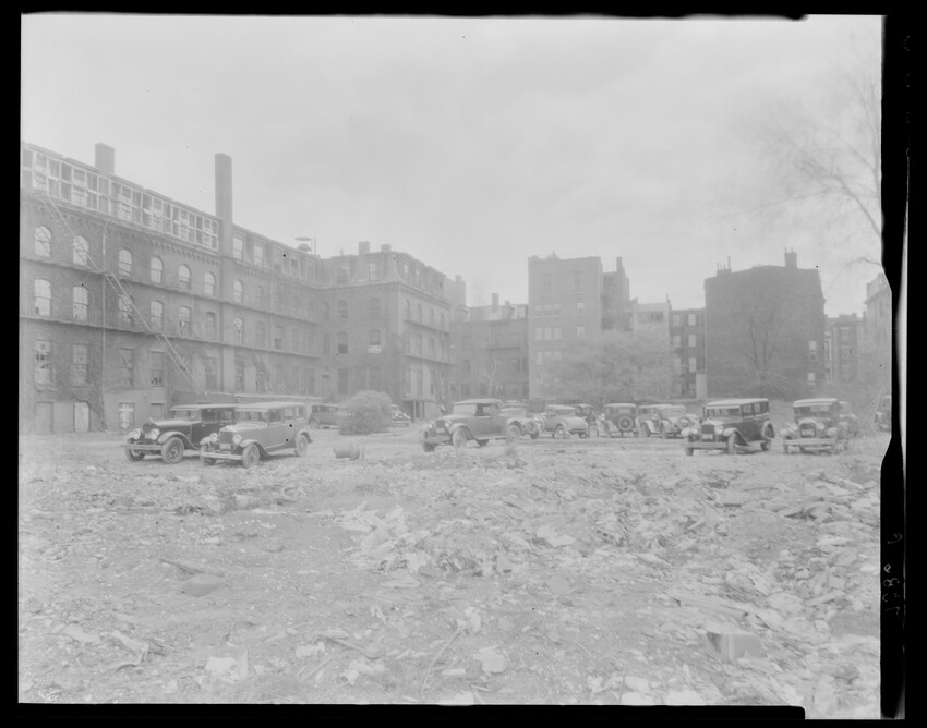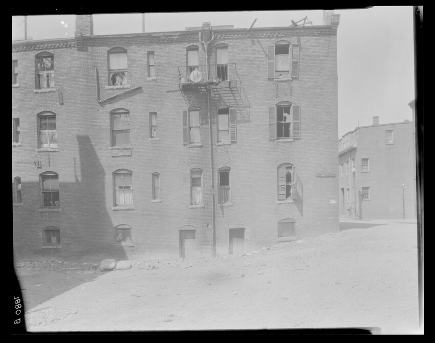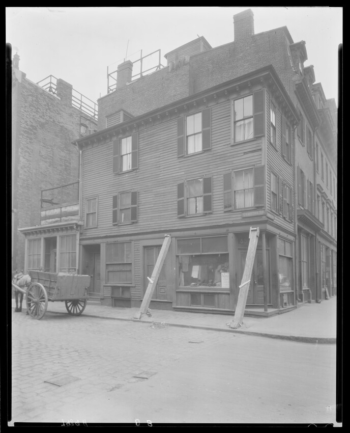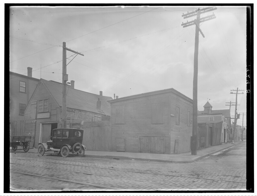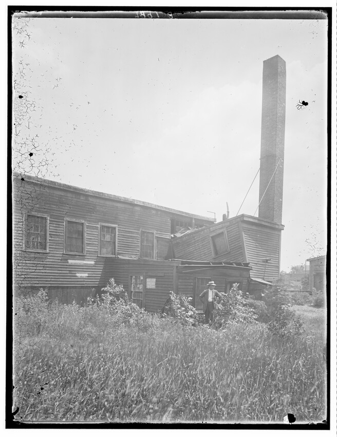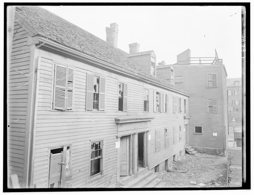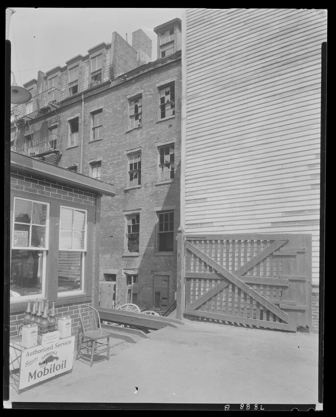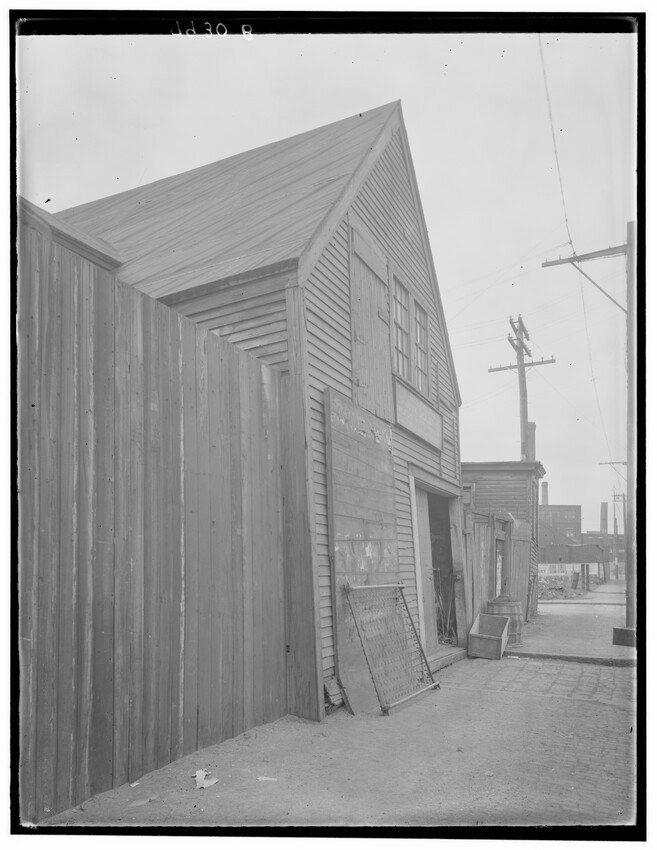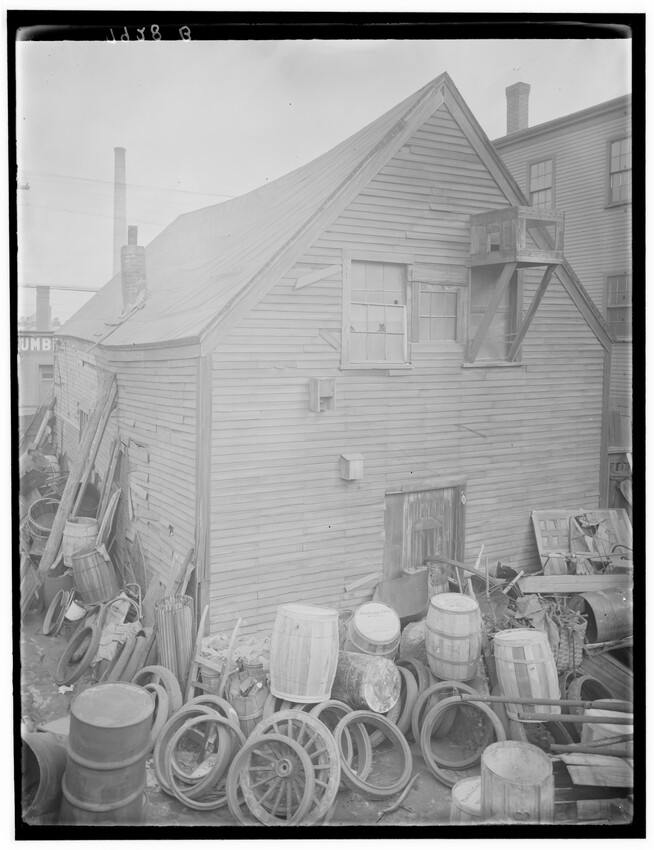 The image shows a cluttered area outside a wooden building identified as E. Ginsburg Junk Dealer, located at 27-33 Southampton Street, Boston, Massachusetts. Various discarded items, including barrels, wheels, and other miscellaneous objects, are scattered around the building. The structure has a st...