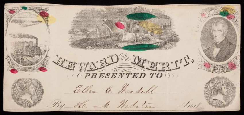 Boston Latin School attendance cards, handmade rewards, images of trains, and a fine 1843 example of lace-paper work technique. A steel plate engraving by A.C. Beaman. A micro collection of rewards given to Frank Tinkham by teacher W.N. Dean.
