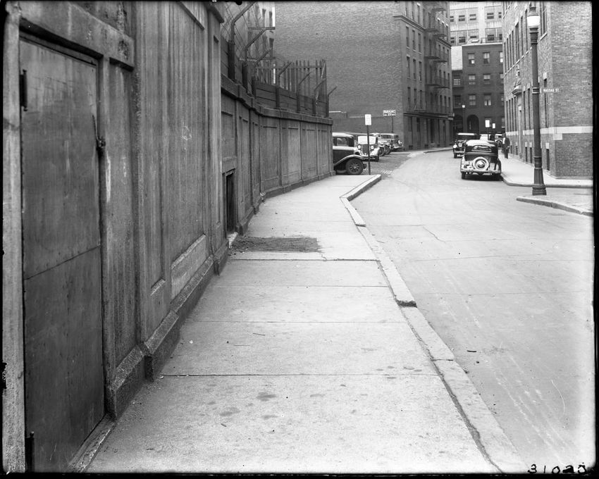 Ash St. Opposite No. 28, South End, Boston. At the corner of Nassau St. Autos, buildings, pedestrian.