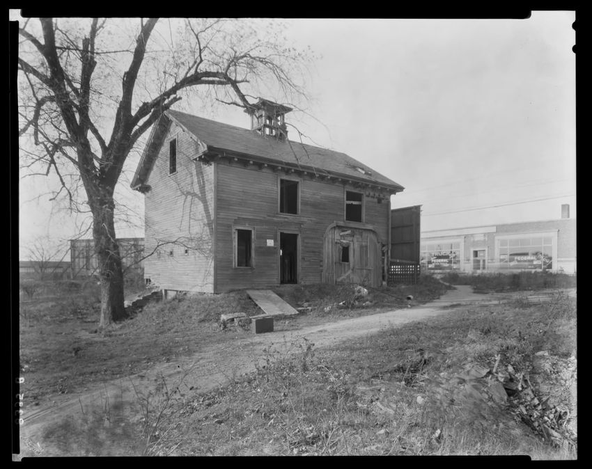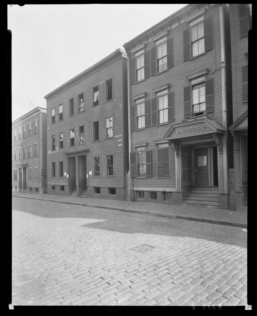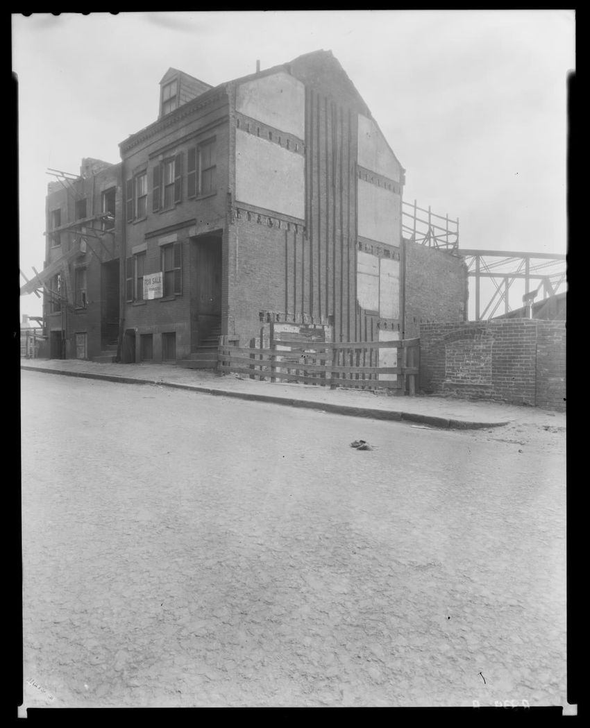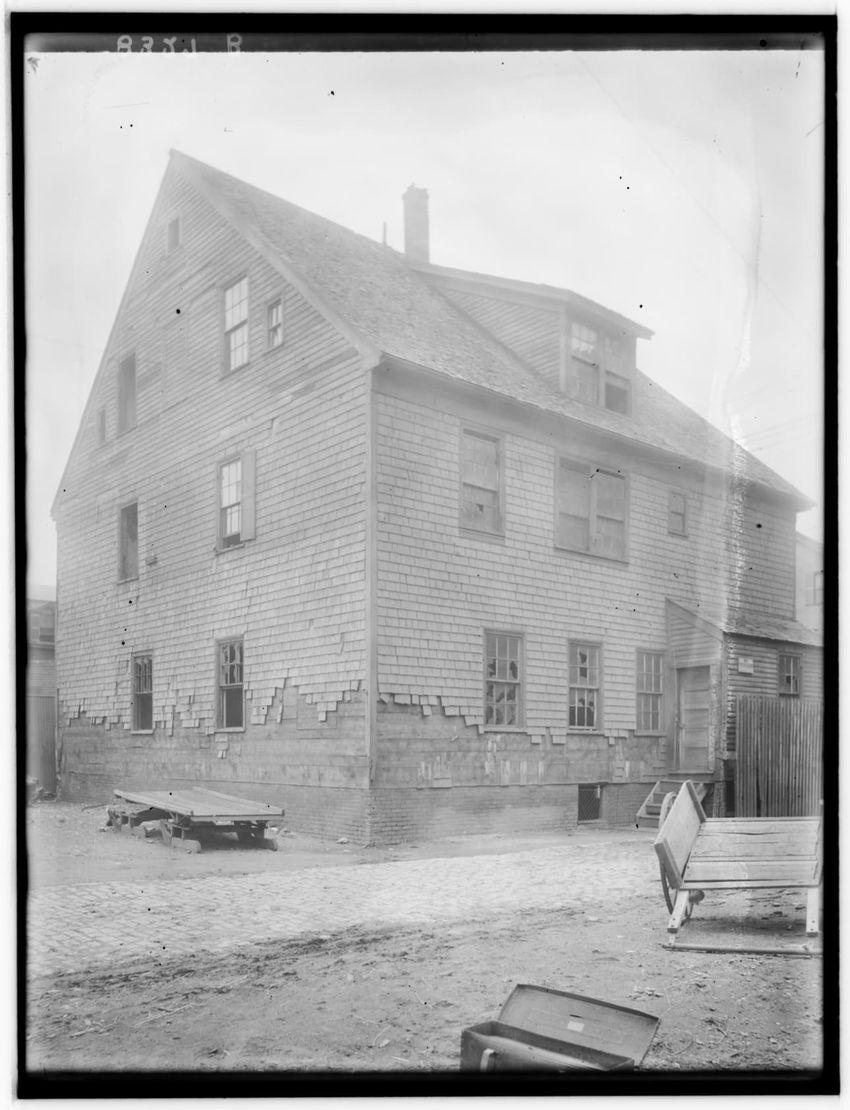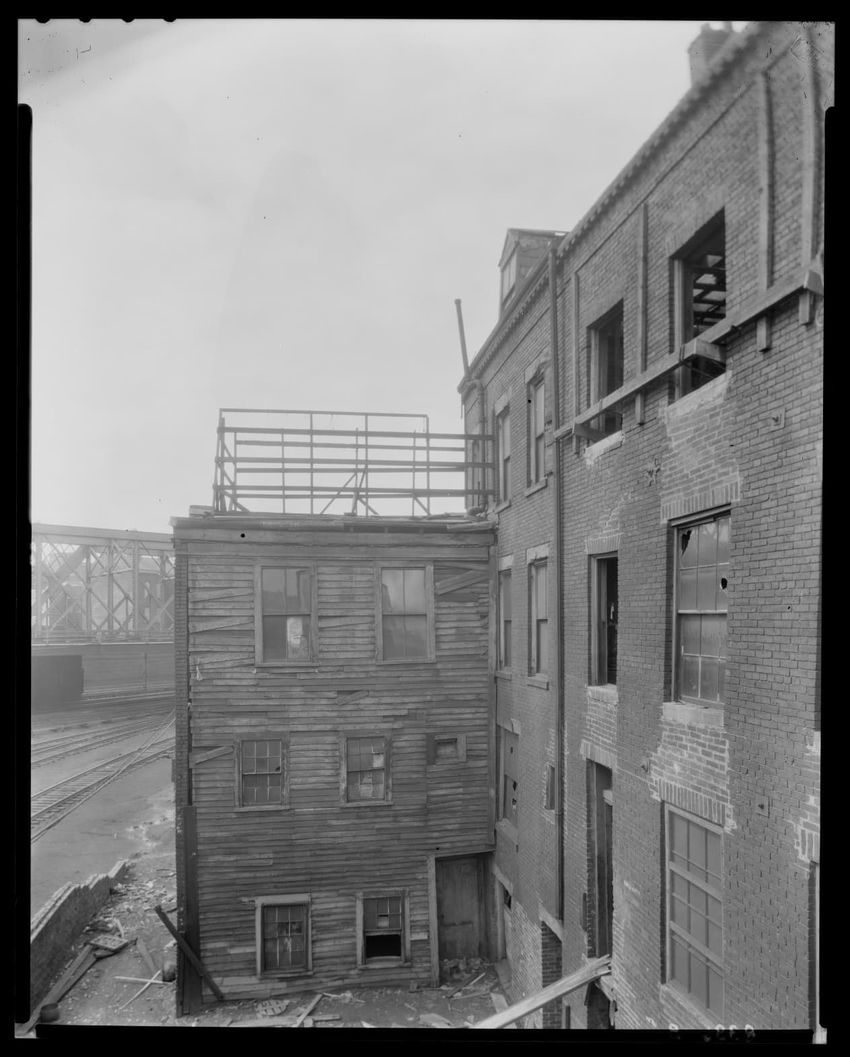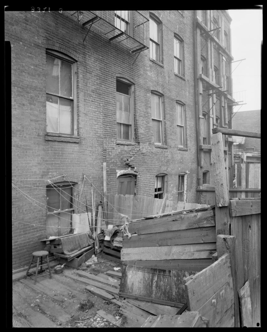 The image shows the rear exterior of a house located at 125 Linden Park Street, Roxbury, Boston, Massachusetts. It features an old wooden structure with visible signs of wear, including a damaged roof. There are multiple windows, climbing plants, and a notice posted on the wall. Various wooden board...