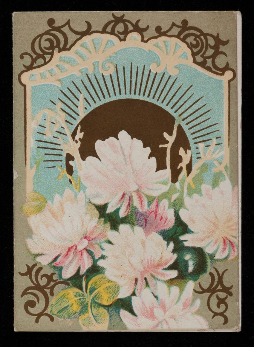 The store carries Bibles, photograph albums, writing desks and has a circulating library. Text on the verso reads "Compliments of the season."