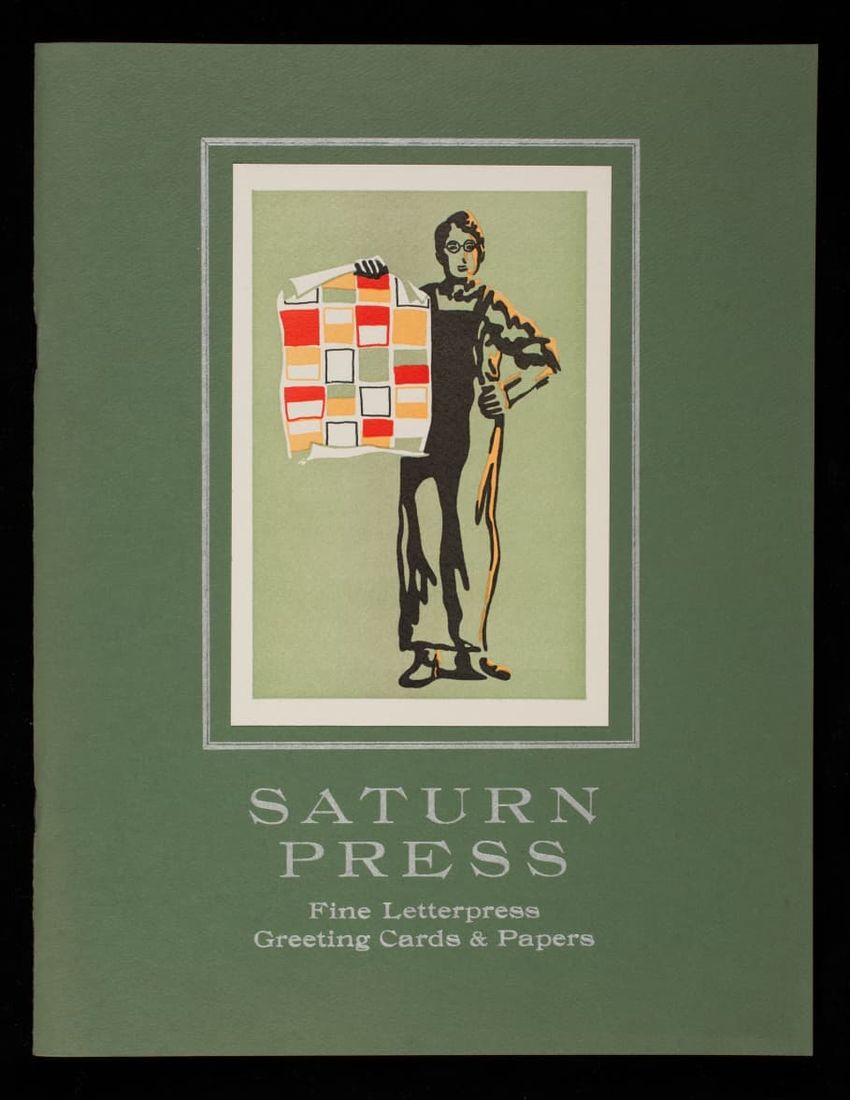 Greeting cards on various topics and for different occasions are described in the catalog. Background on letterpress printing and Saturn Press is provided. There is an order form and loose business envelope.