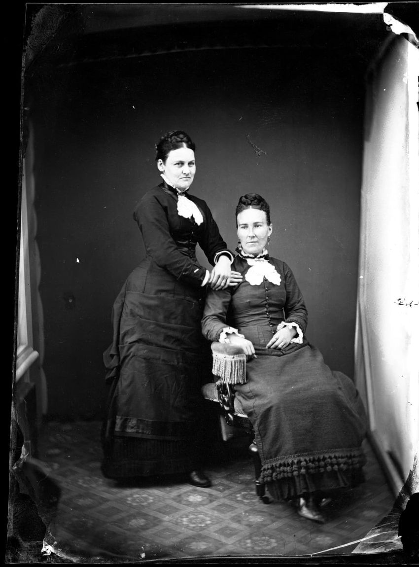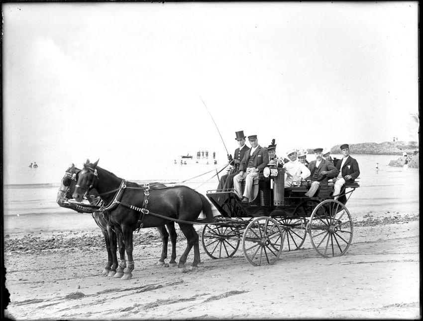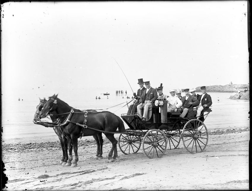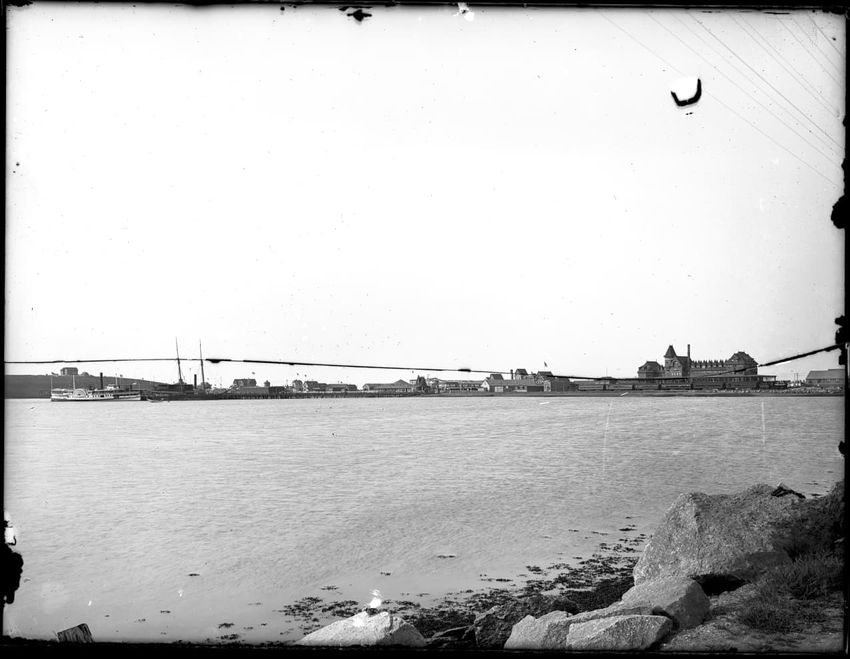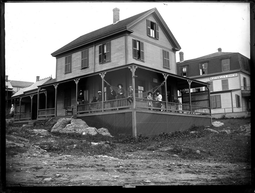 View of Bluffton Cottage, which sits on top of a dune. The grass and rocks of the dune are visible in the foreground and seperated from the cottage by a fence. People stand on the porch of the cottage where a hamock has been suspended. A few surrounding buildings are visible.