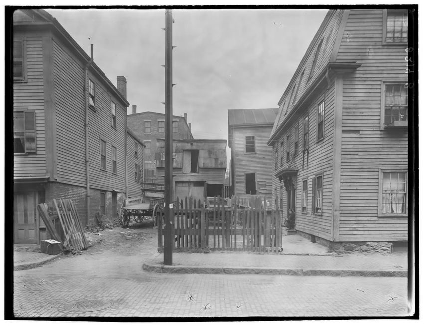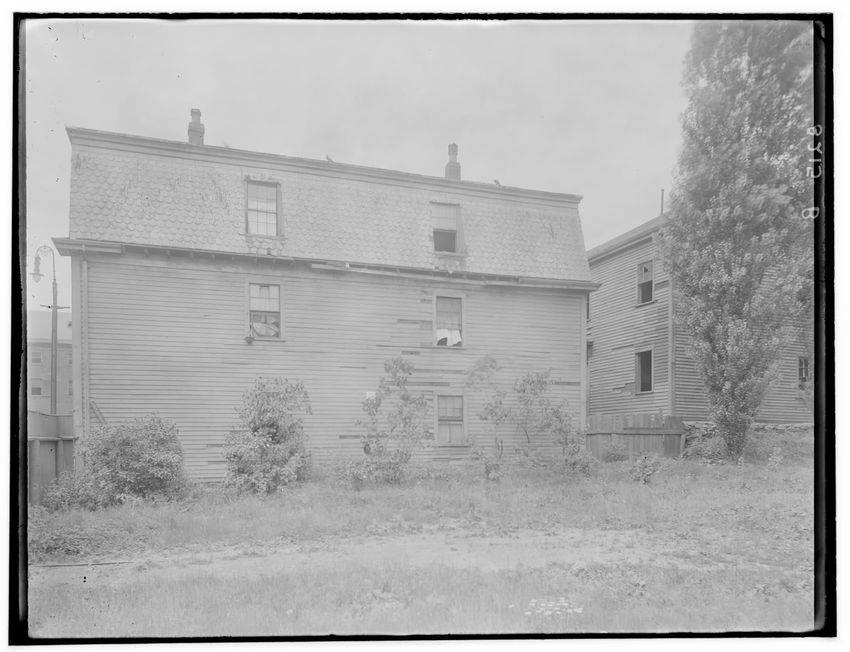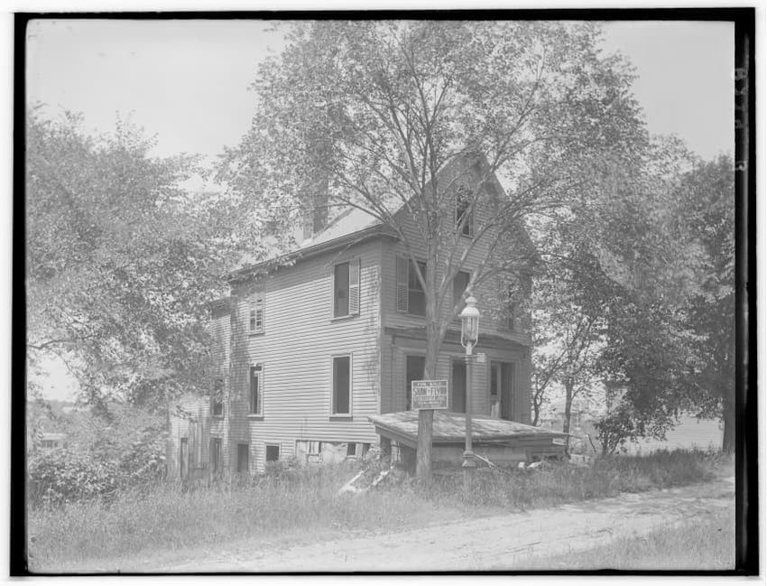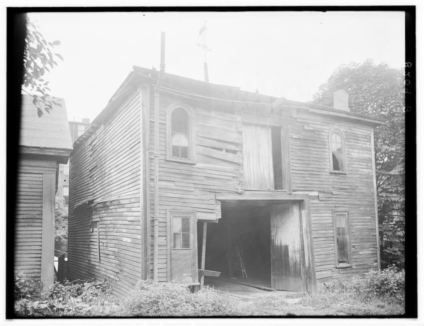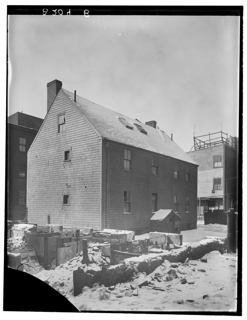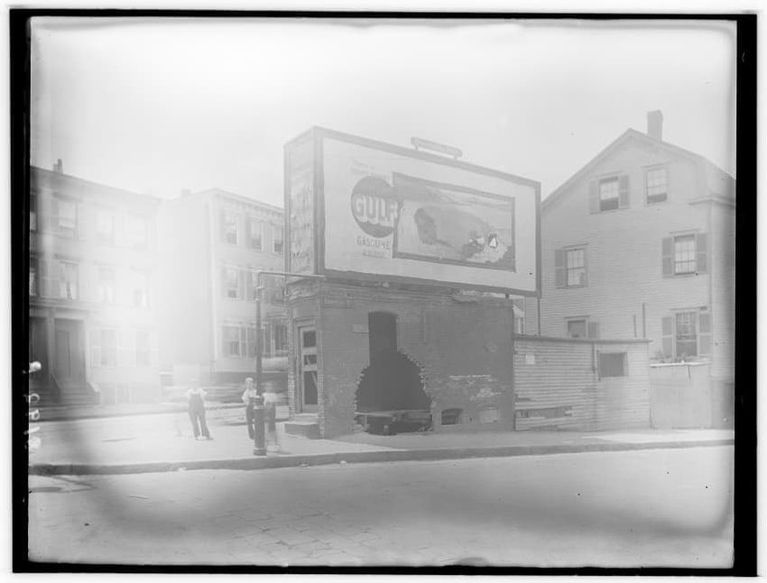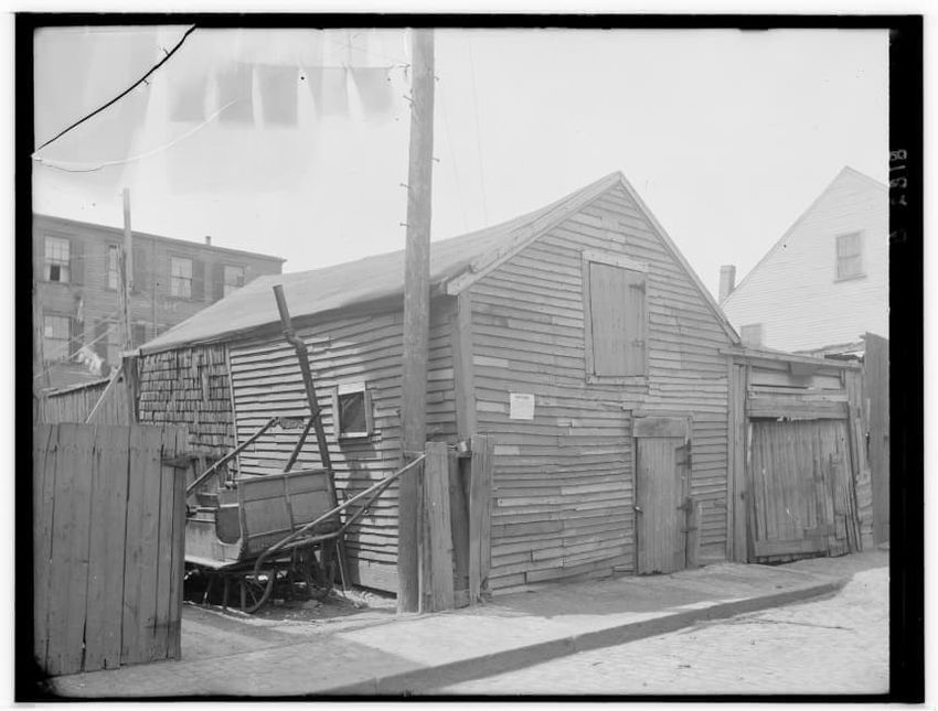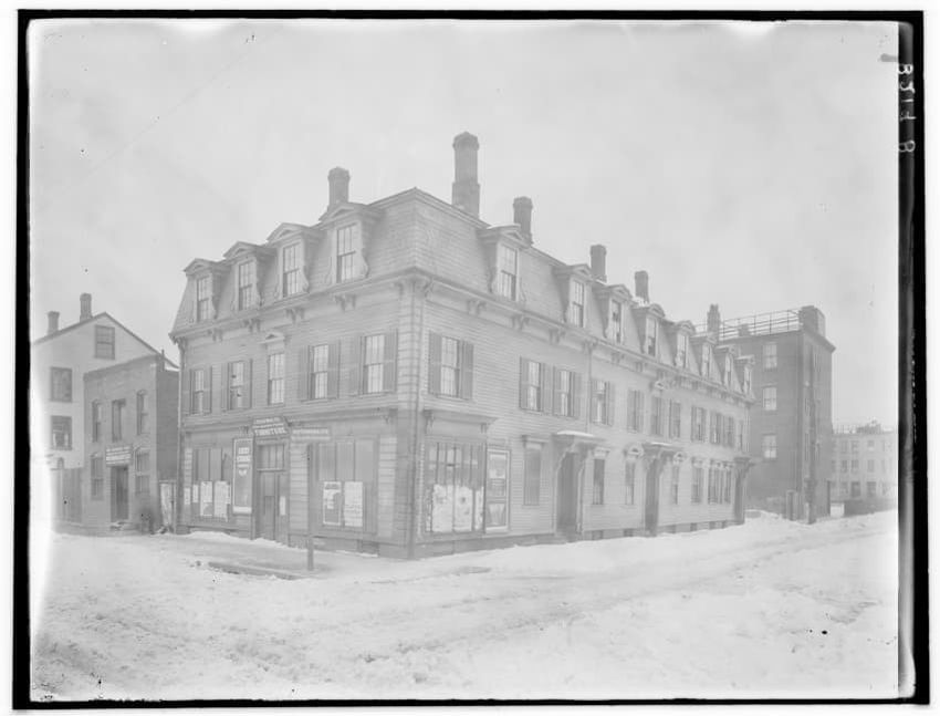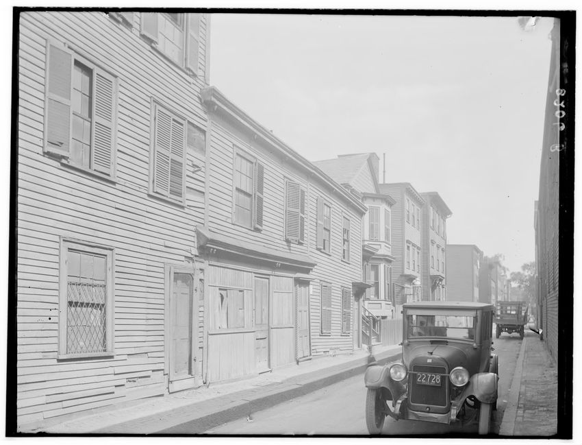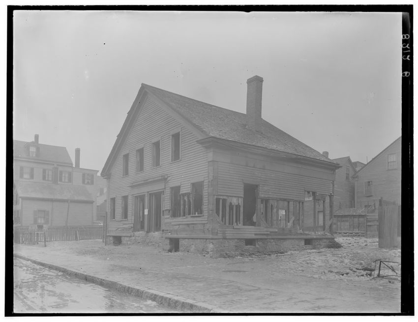 The image depicts the exterior of stores located at 7-15 Eustis Street in Roxbury, Boston, Massachusetts. A street runs past the wooden buildings, with signs mentioning "Iron, Metals, Machinery, Boilers, Motor" visible. An early automobile and a streetcar on tracks are present on the right side. A f...