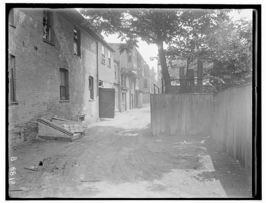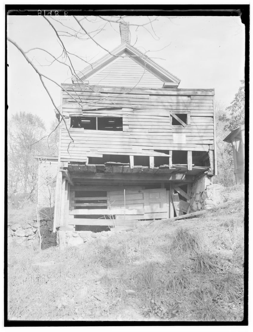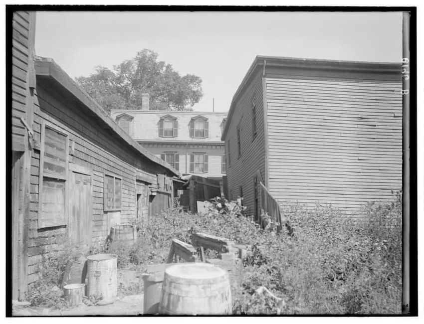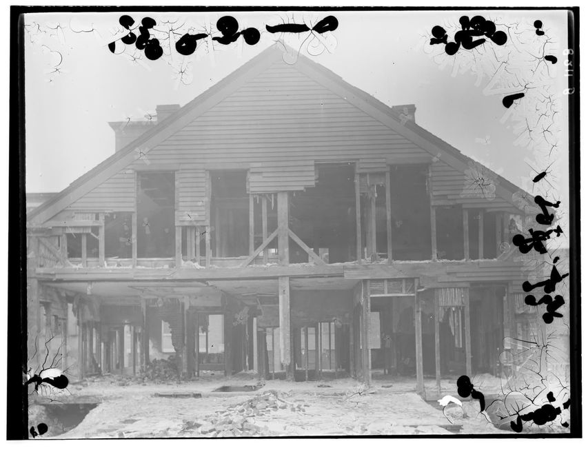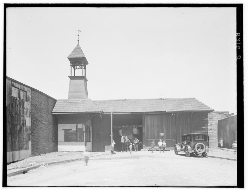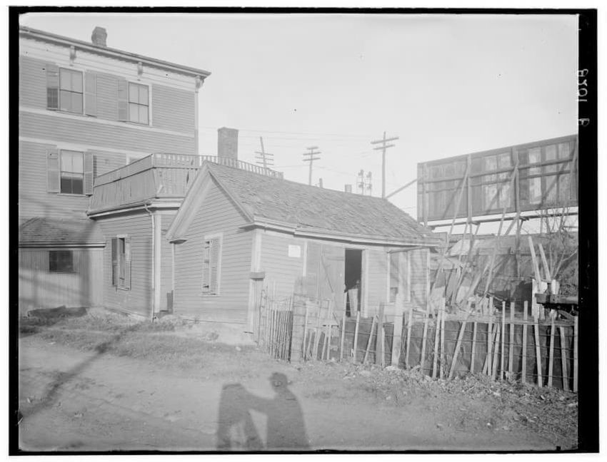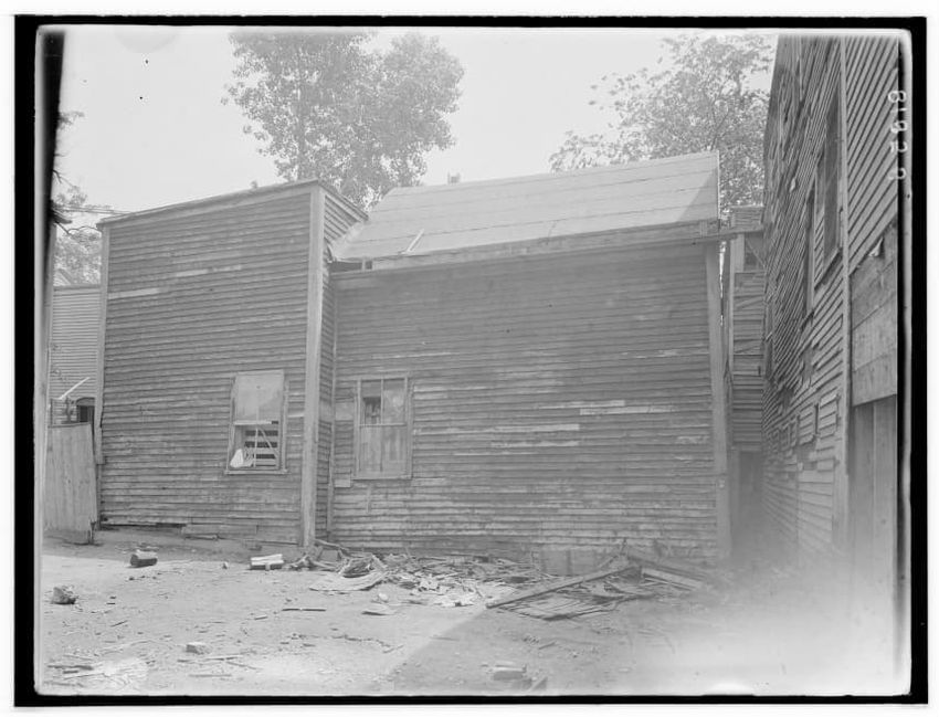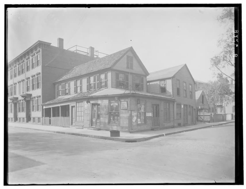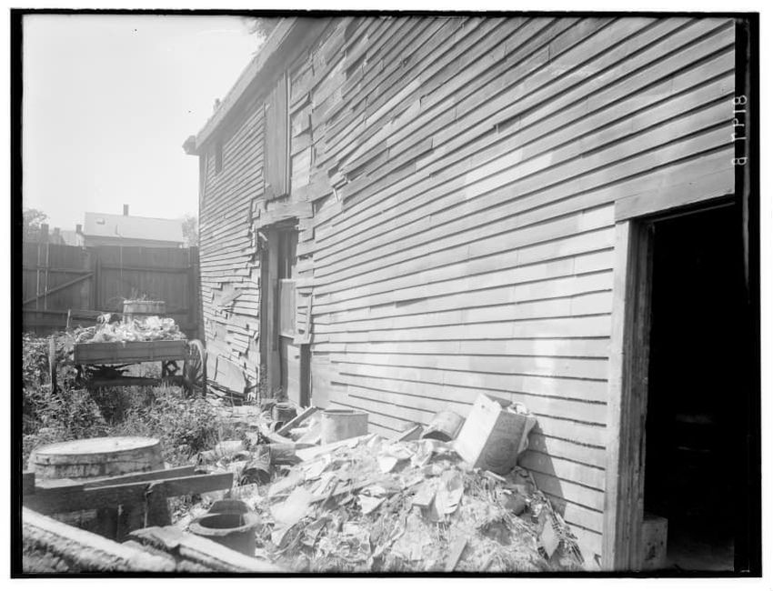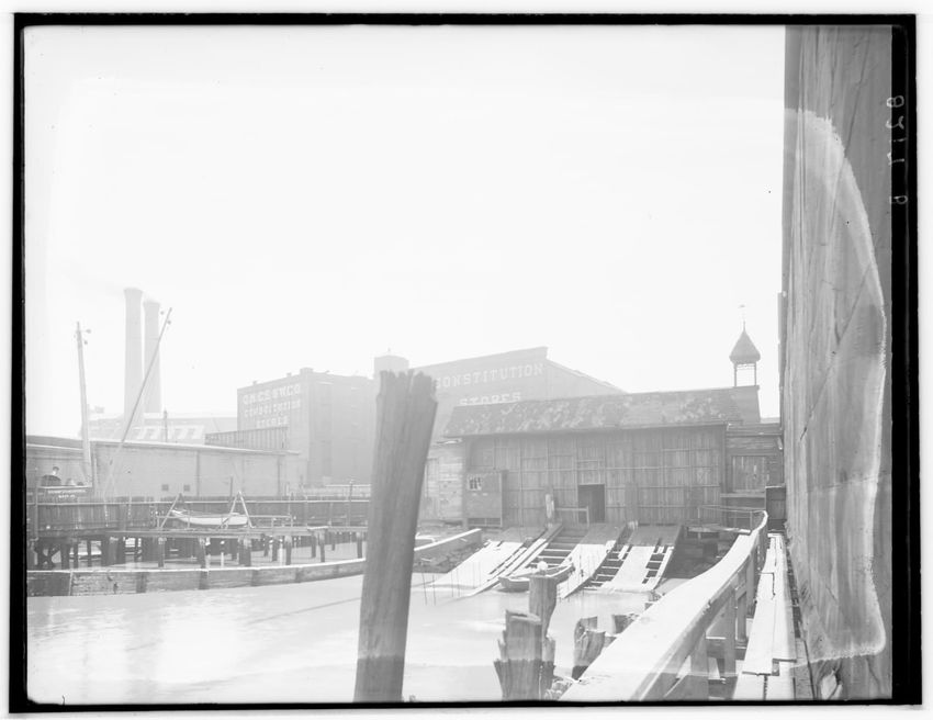 The image depicts the exterior of stores located at 7-15 Eustis Street in Roxbury, Boston, Massachusetts. A street runs past the wooden buildings, with signs mentioning "Iron, Metals, Machinery, Boilers, Motor" visible. An early automobile and a streetcar on tracks are present on the right side. A f...