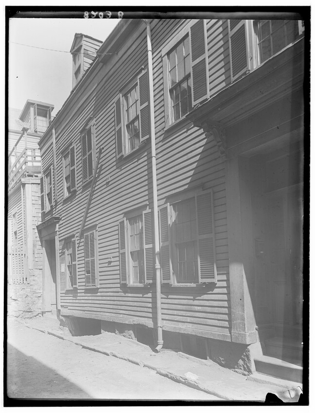 The image depicts the exterior of stores located at 7-15 Eustis Street in Roxbury, Boston, Massachusetts. A street runs past the wooden buildings, with signs mentioning "Iron, Metals, Machinery, Boilers, Motor" visible. An early automobile and a streetcar on tracks are present on the right side. A f...