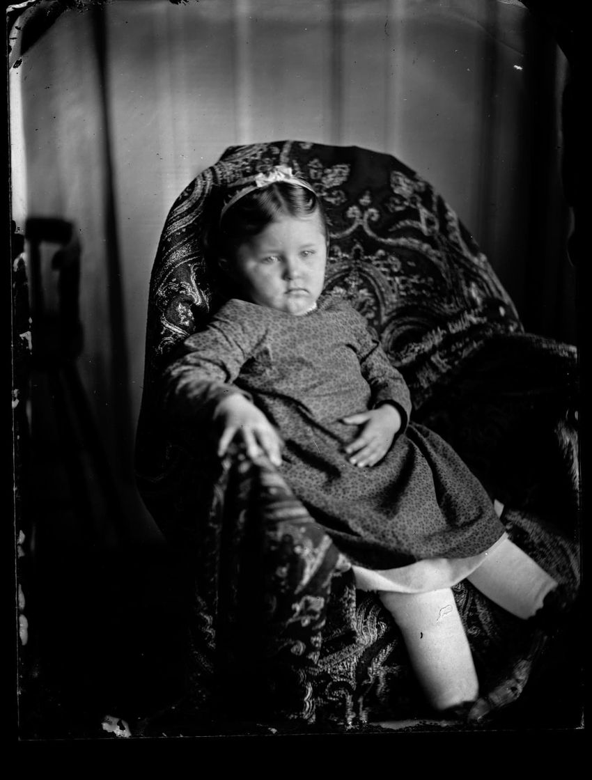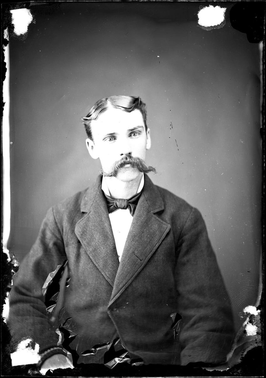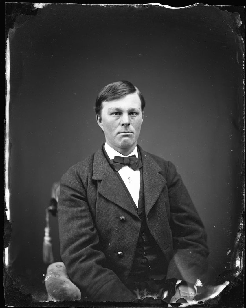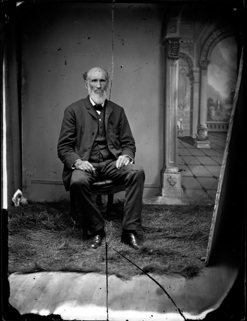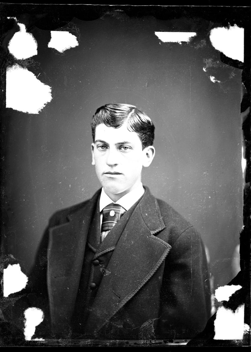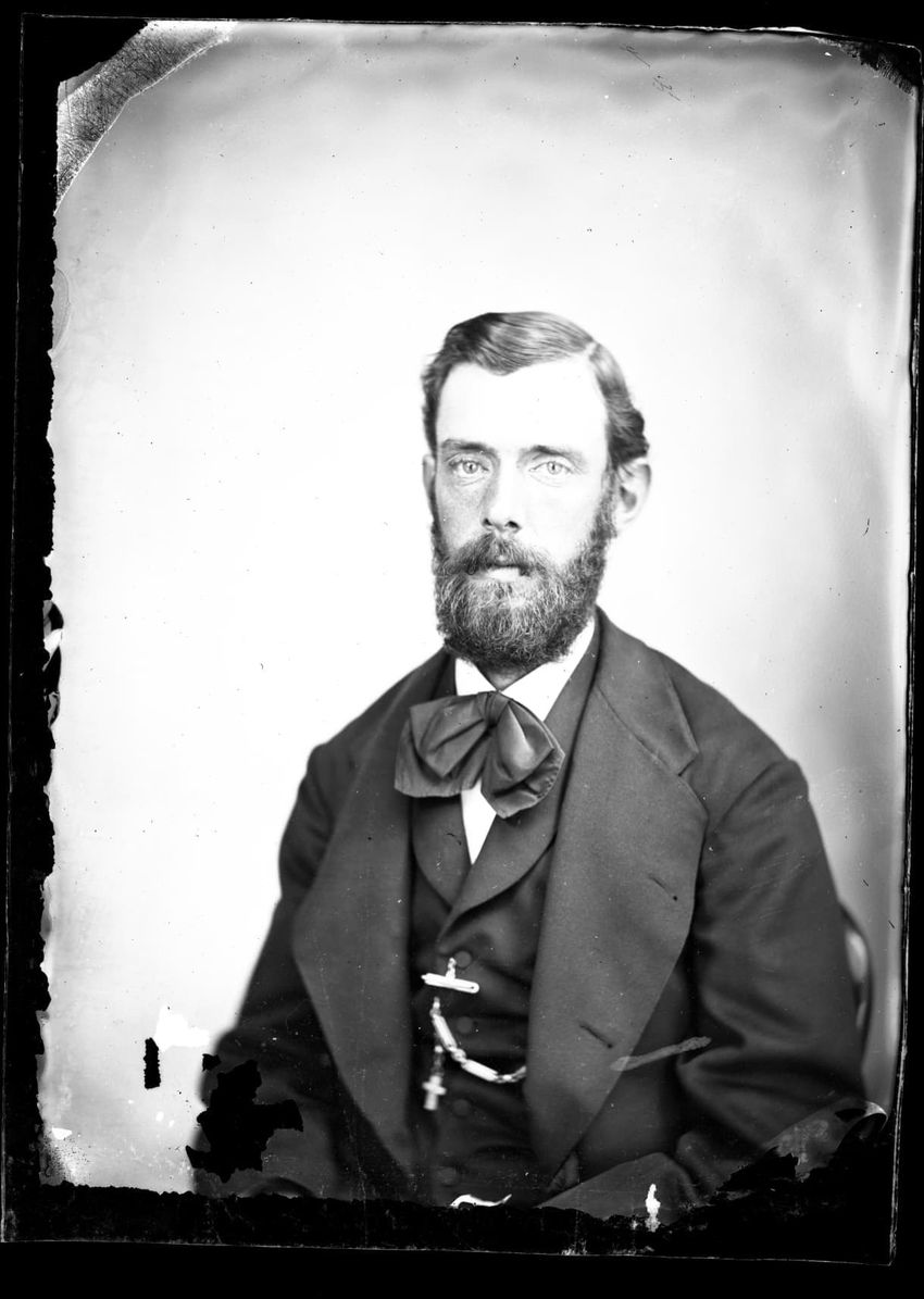 Portrait of a man, seated. The subject wears a chain of some sort attached to his vest and jacket, perhaps a pocket watch; on the end of the chain is a cross. Scraps of paper are still attached to the glass plate as if it was glued to something at one point.