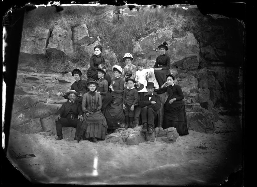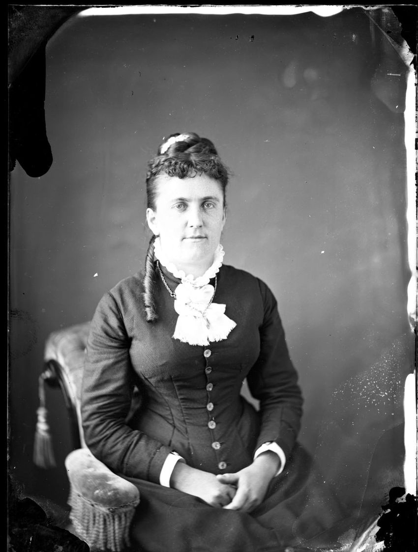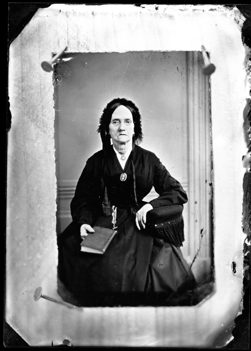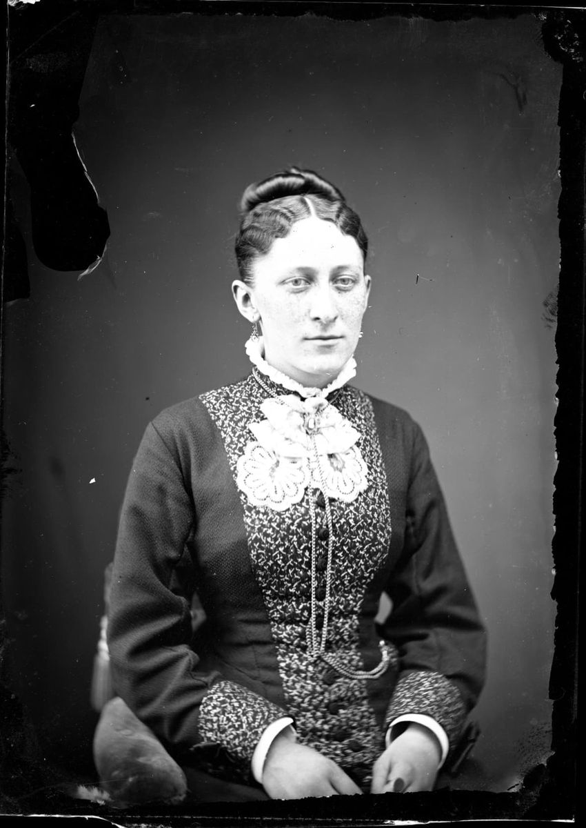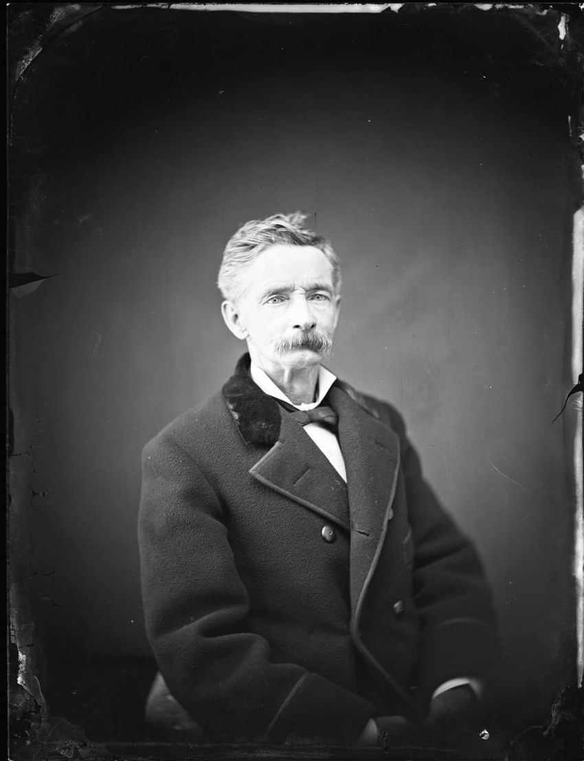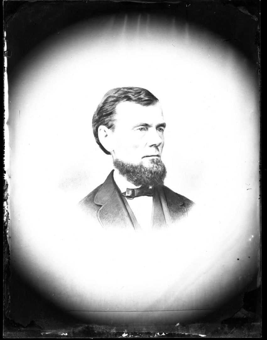 Portrait of a man, seated. The subject wears a chain of some sort attached to his vest and jacket, perhaps a pocket watch; on the end of the chain is a cross. Scraps of paper are still attached to the glass plate as if it was glued to something at one point.