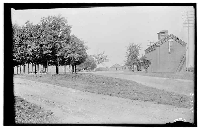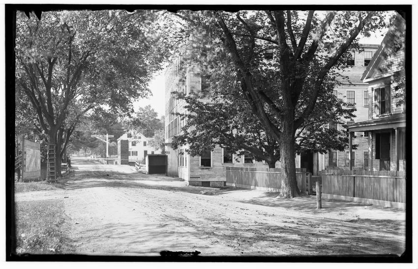 The image shows a view of Spring Street in Natick, Massachusetts. Visible are large trees lining a dirt road, with wooden buildings on the right side. A wooden fence separates the buildings from the street. In the distance, there are additional structures, and a signpost is located at an intersectio...