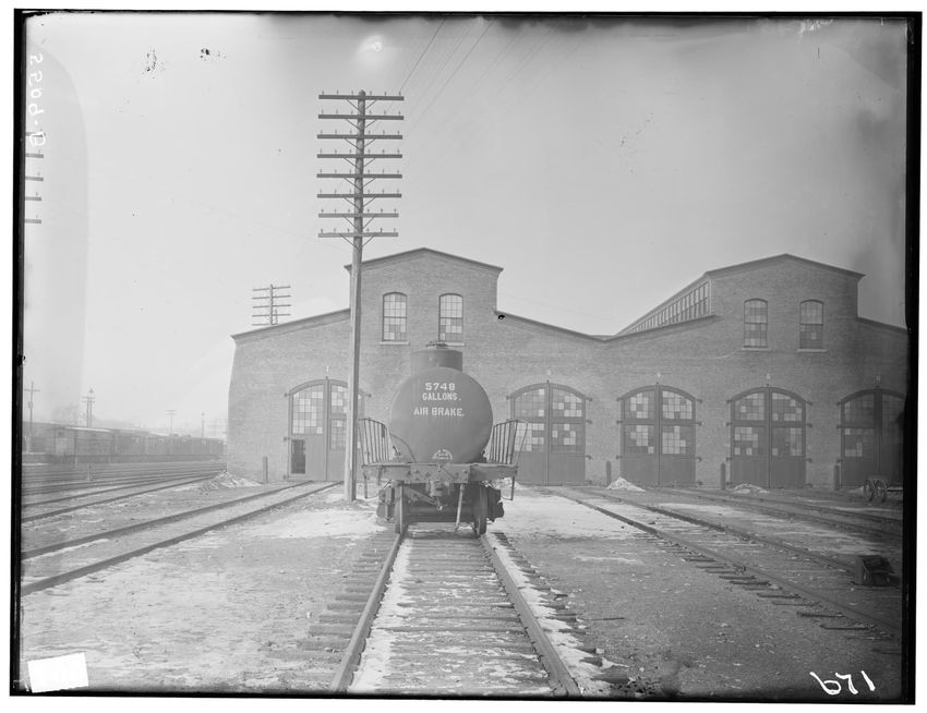 The image shows the exterior view of the Allston Car Repair Shops located in Brighton, Boston, Massachusetts. The building is made of brick and features large arched windows and doors. In front of the building, there are multiple railway tracks and a tanker labeled "5748 gallons, air brake." The str...
