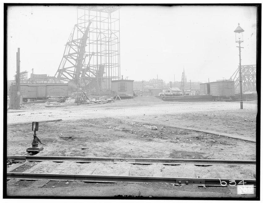 The image shows a view of the Boston Yard near a drawbridge over Fort Point Channel, associated with the Old Colony Railroad in Boston, Massachusetts. In the foreground, there are railroad tracks, dirt, and a lamppost. The background features various structures, including construction elements and s...