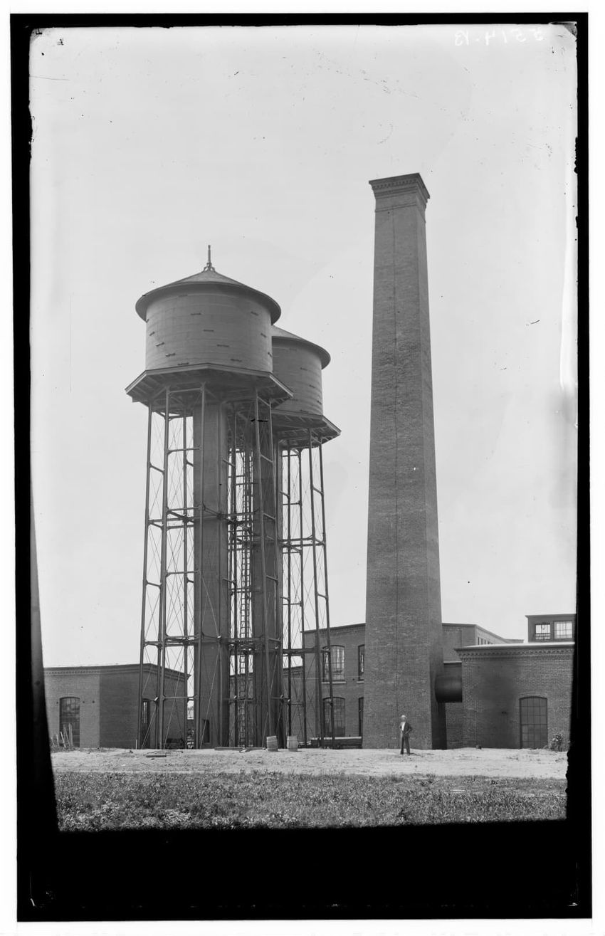 The image shows two elevated water towers supported by metal structures in West Springfield, Massachusetts. Next to the towers is a tall brick chimney. In the background, brick buildings are visible. A person is standing on the ground near the base of the structures.
