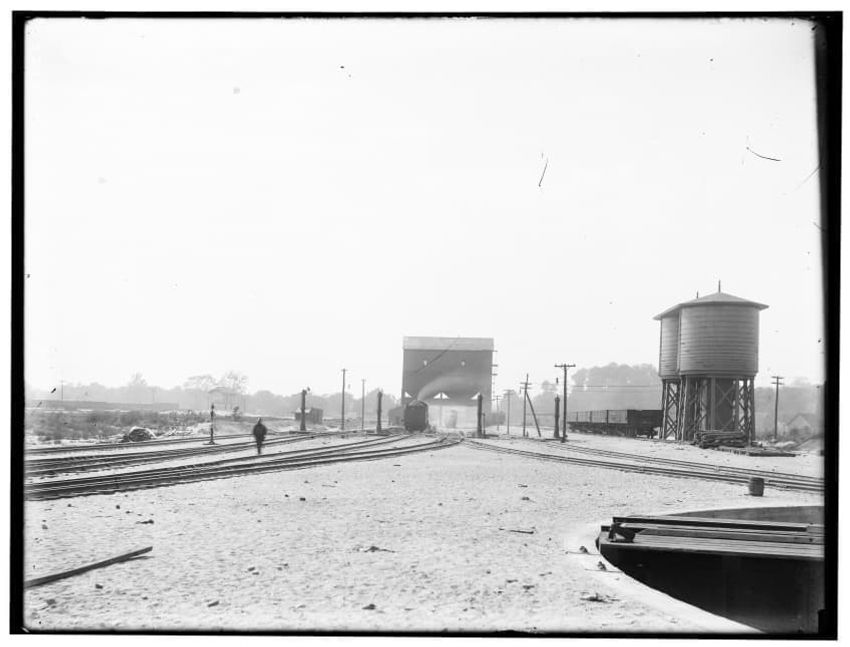 The image shows a coaling plant from the engine house in West Springfield, Massachusetts. Visible elements include railroad tracks leading to a large structure used for coaling as well as a water tower on the right. A person is seen walking along the tracks and several utility poles are present in t...